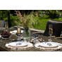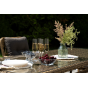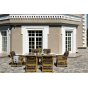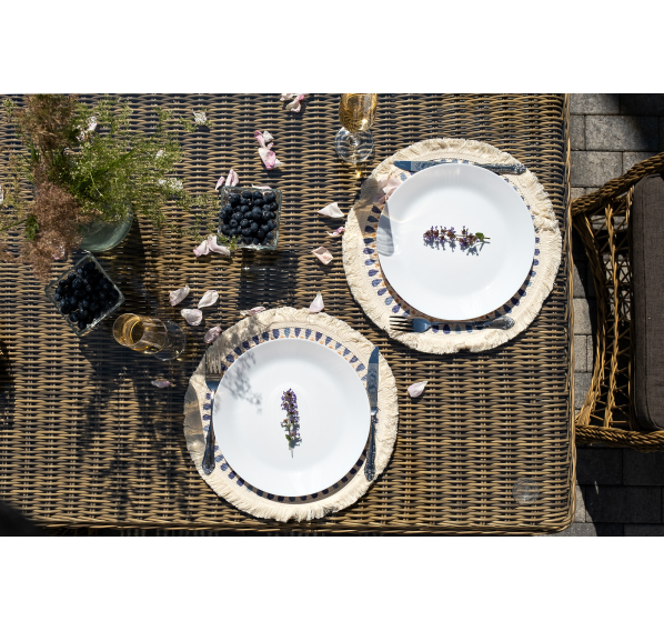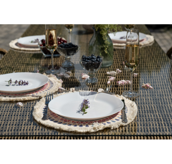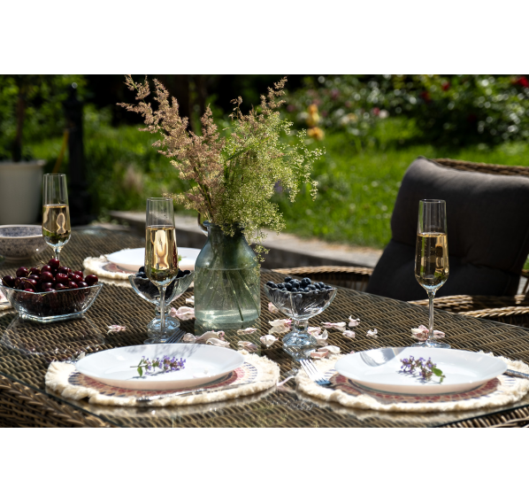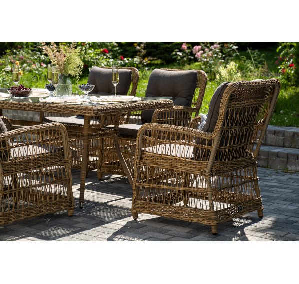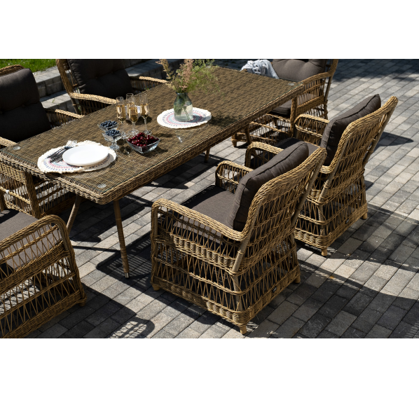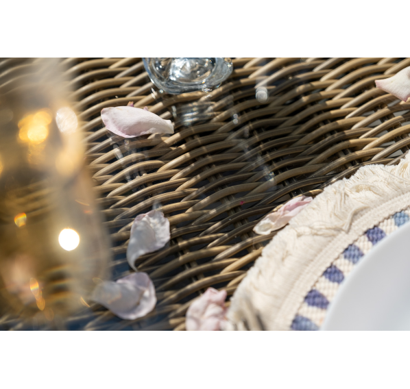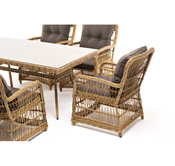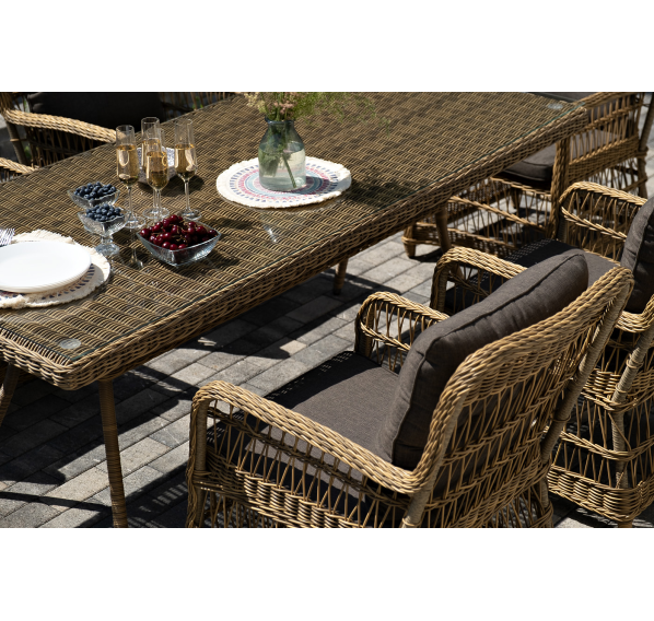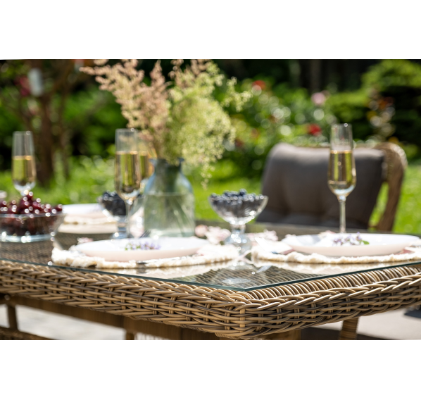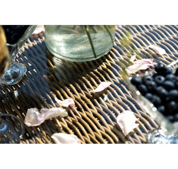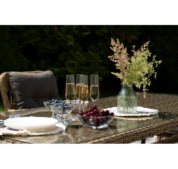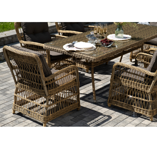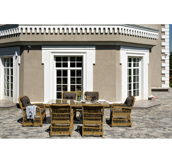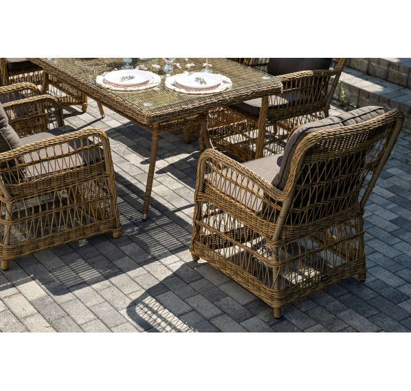 Вся мебель изготовлена из алюминия, вручную оплетенного круглым искусственным ротангом натурального соломенного оттенка. Столешница укомплектована ударопрочным стеклом, толщиной 5 мм. Данное стекло крепится к столу при помощи четырех вакуумных силиконовых присосок и поставляется в собранном виде.
