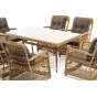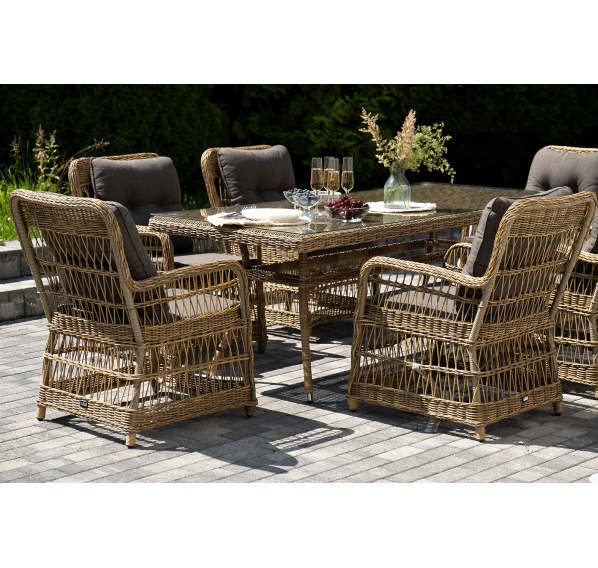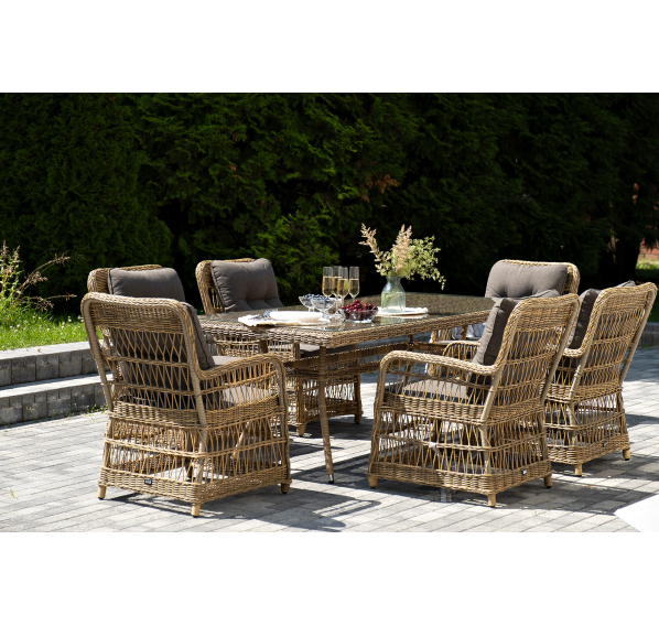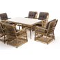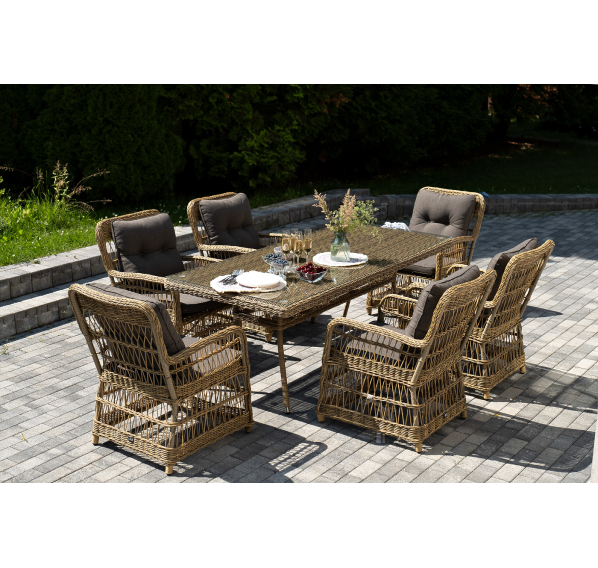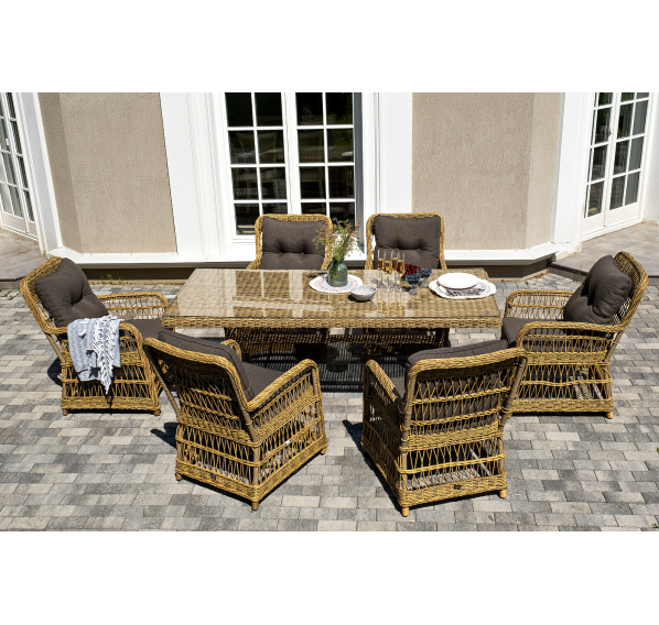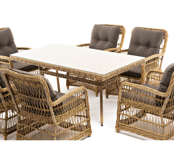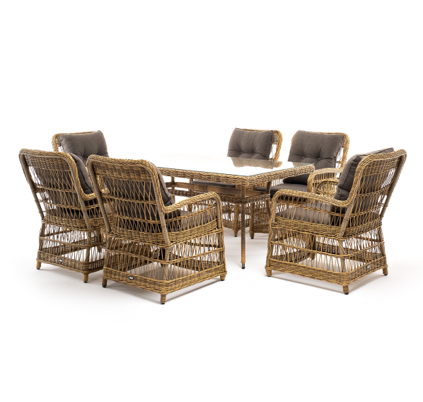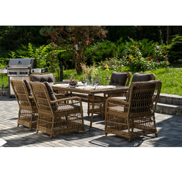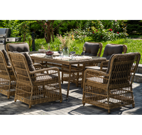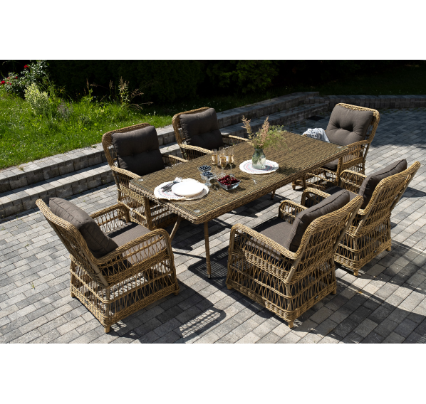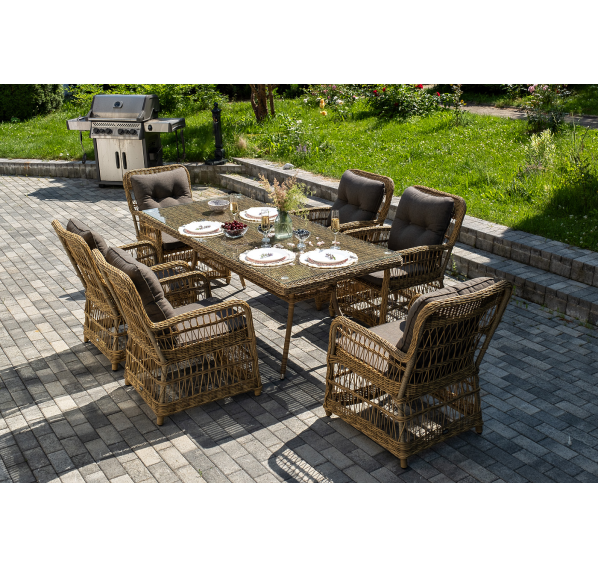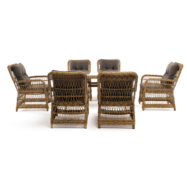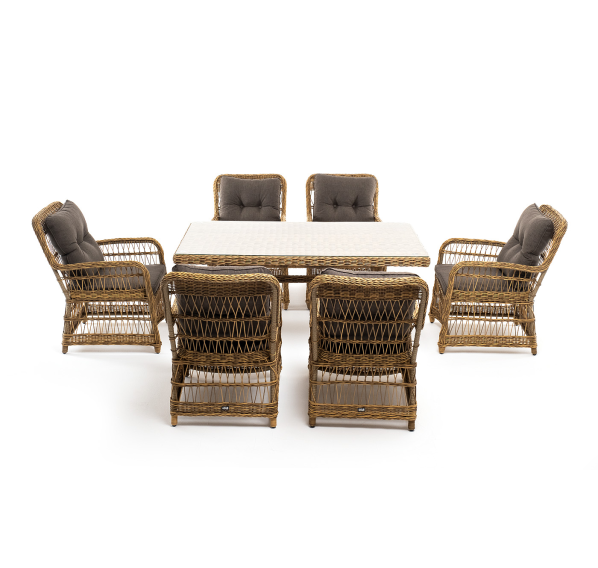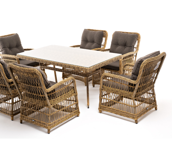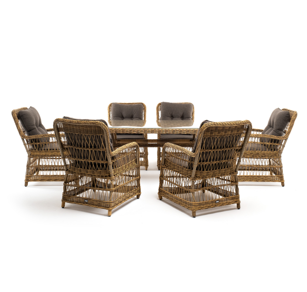 Садовая обеденная группа на 6 персон «Цесена» из ротанга. В комплекте: большой прямоугольный обеденный стол (1600×900×750 мм) и 6 кресел (600×800×910 мм).