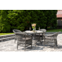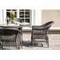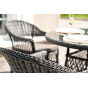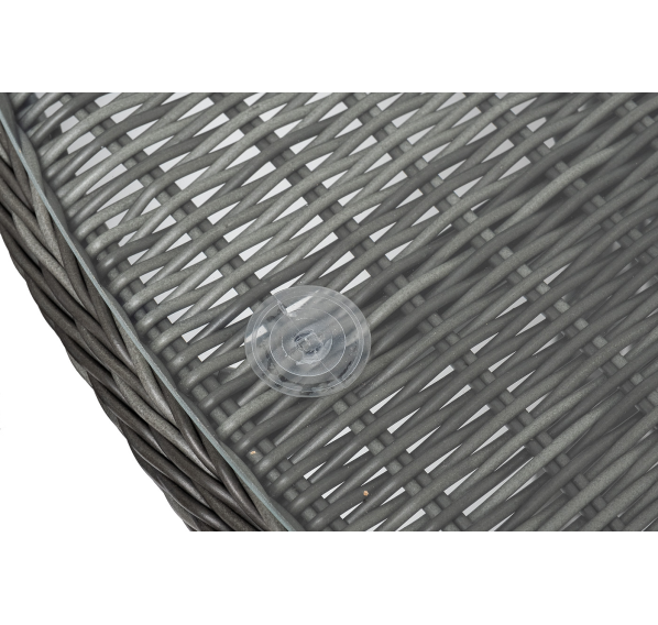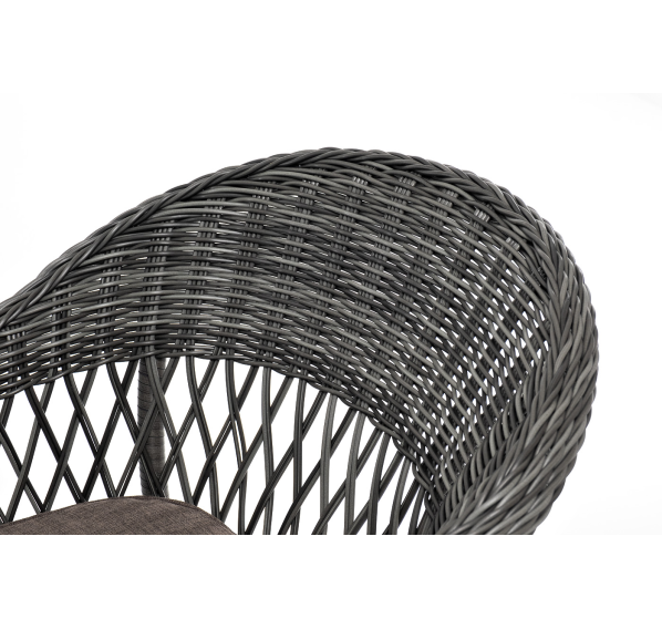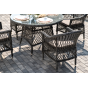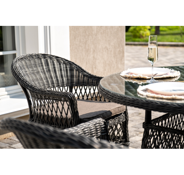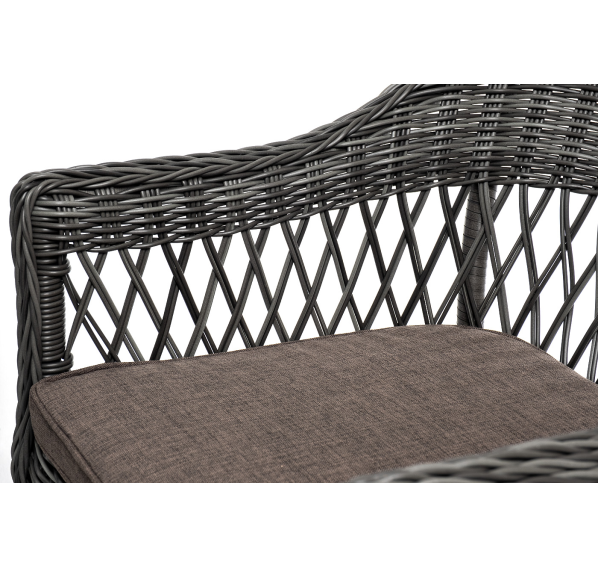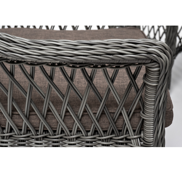 Вся мебель изготовлена из алюминия, поэтому ее очень легко перемещать. Декоративное покрытие выполнено из долговечного искусственного ротанга, устойчивого к перепадам температур и переменам погоды. Столешница изготовлена из прочного закаленного стекла 5 мм, кресла укомплектованы подушками серого цвета со съёмными чехлами.