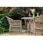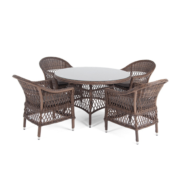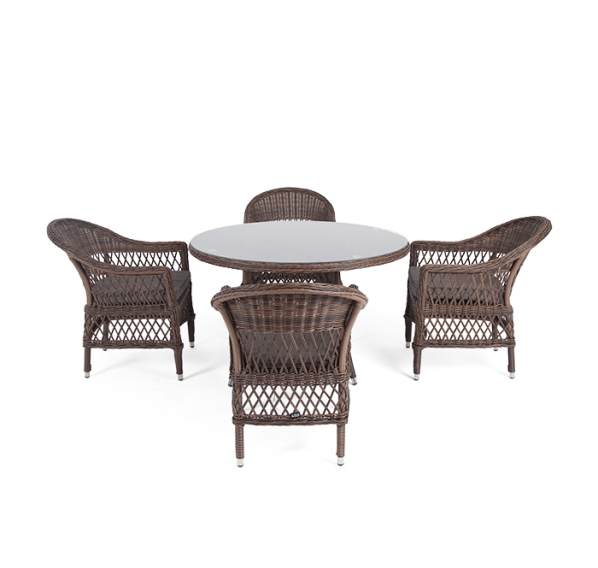 Из алюминия выполнен устойчивый каркас мебели, который задекорирован искусственным ротангом круглого ручного плетения. Комплект представлен в коричневом цвете.