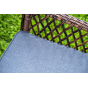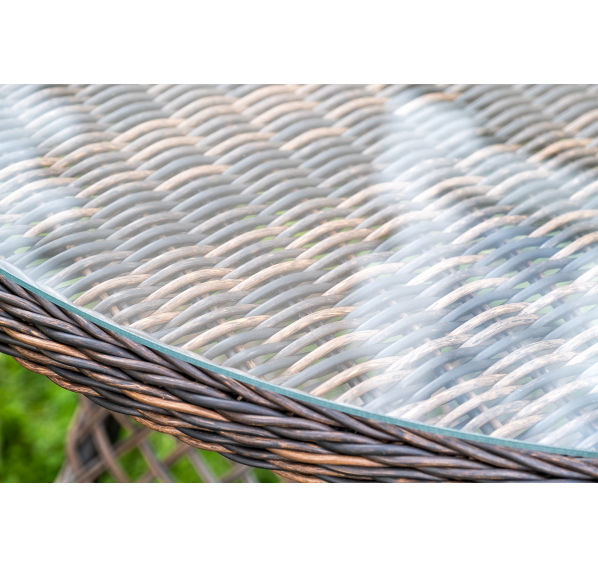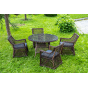 Каркас мебели выполнен из прочного и легкого алюминия, вручную оплетенного круглым синтетическим ротангом натурального коричневого оттенка. На креслах предусмотрены мягкие подушки со съёмными чехлами серого цвета.