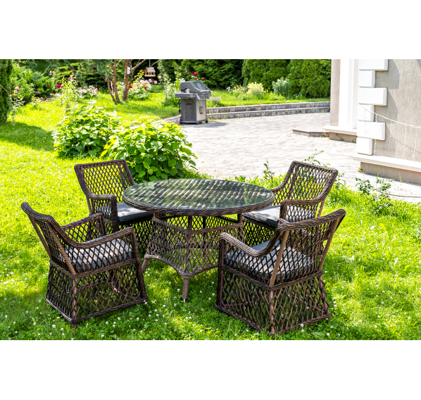 Классическая уличная обеденная группа «Доппио» для сада, летней веранды ресторана. В комплекте круглый обеденный стол «Эспрессо» (1180×1180×750 мм) с ударопрочной стеклянной столешницей и 4 кресла коллекции «Латте» 550×660×850 мм.
