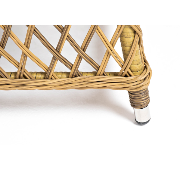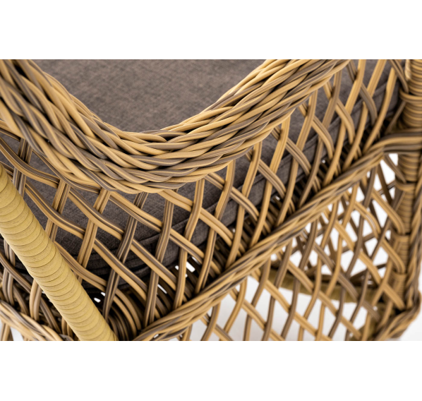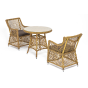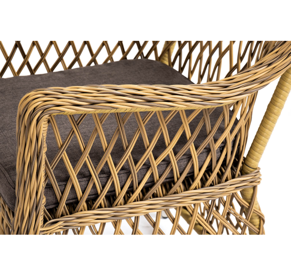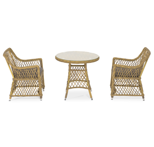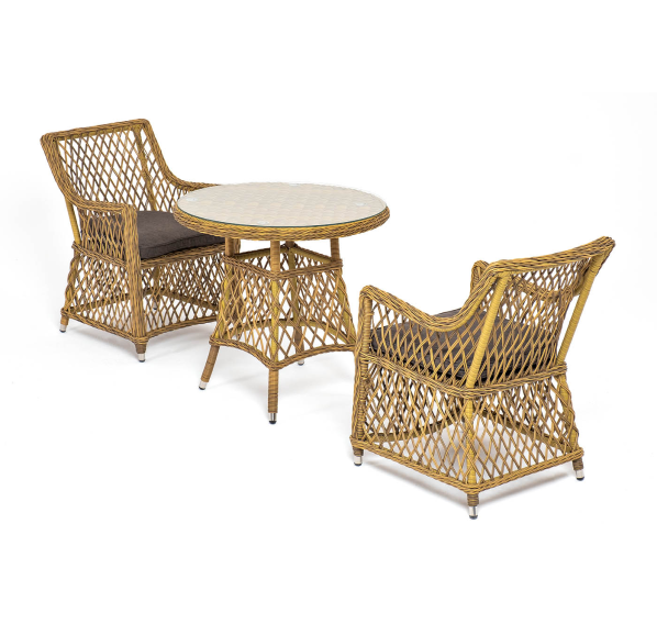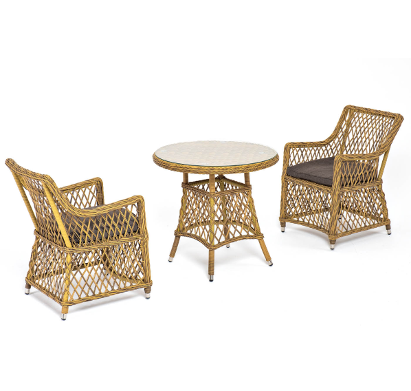 В плетеный комплект входит круглый стол «Эспрессо» диаметром 80 см с ударопрочной стеклянной столешницей и 2 кресла коллекции «Латте» 550×660×850 мм.