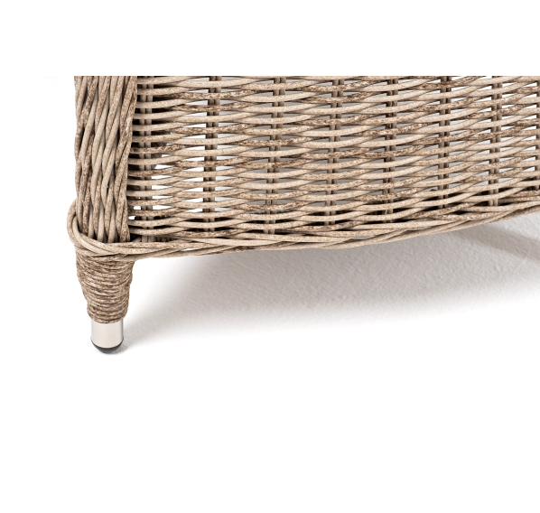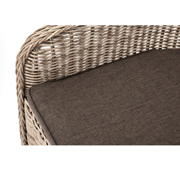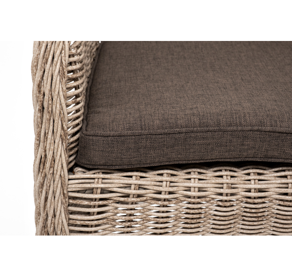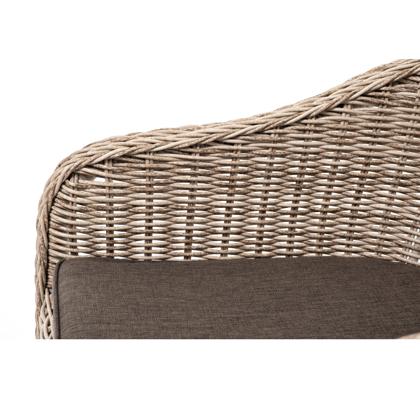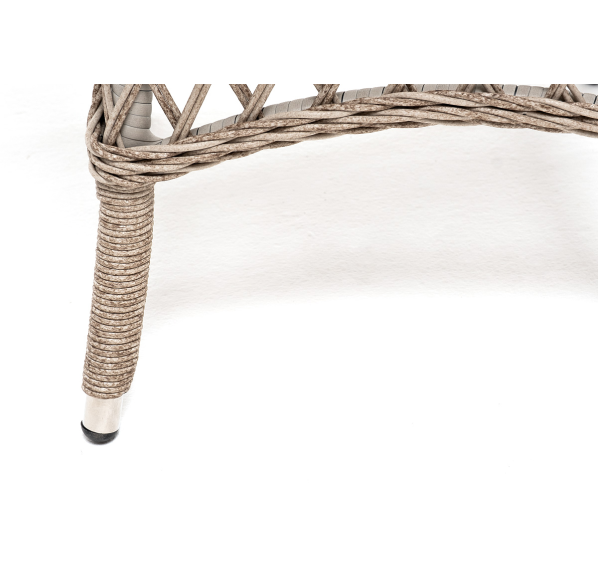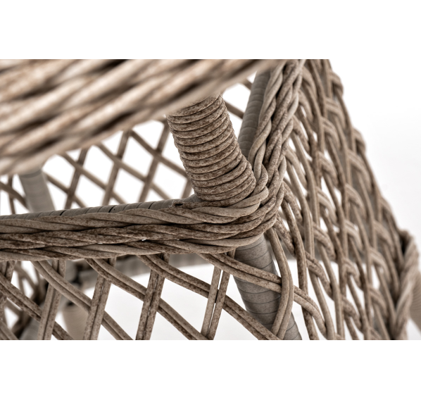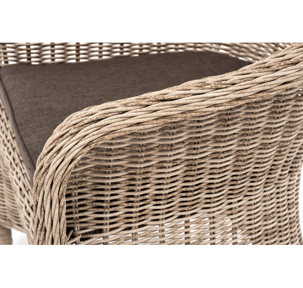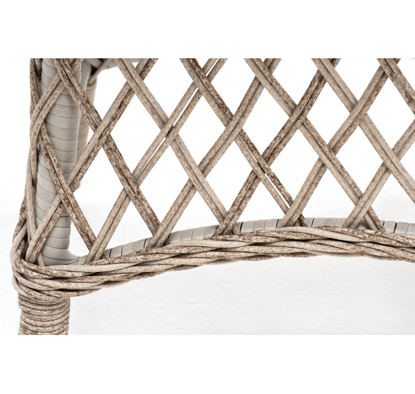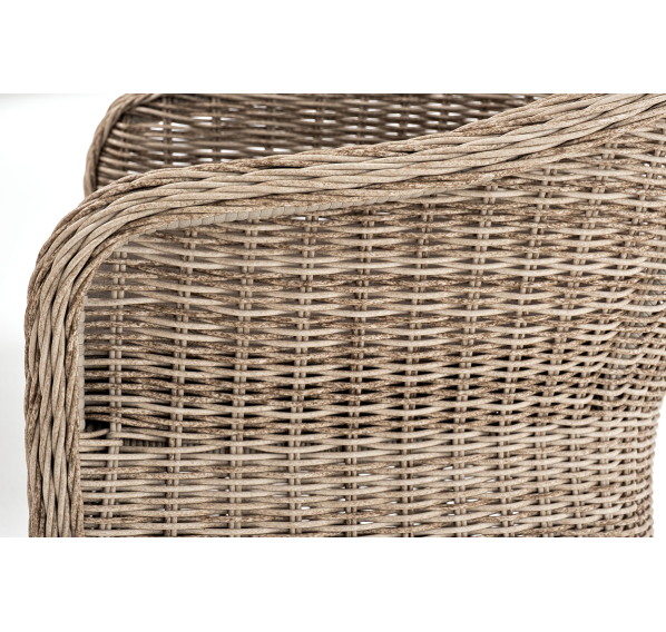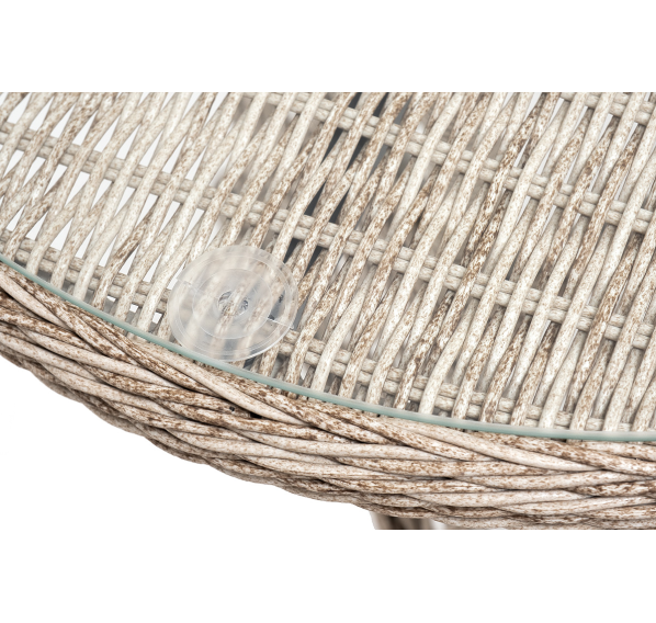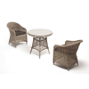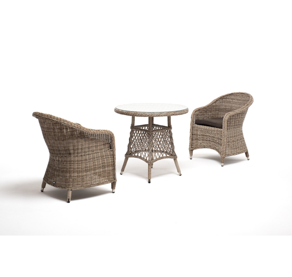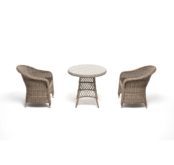 В плетеный комплект входит круглый стол «Эспрессо» диаметром 80 см с ударопрочной стеклянной столешницей и 2 кресла коллекции «Равенна» 570×680×810 мм.