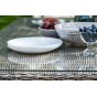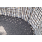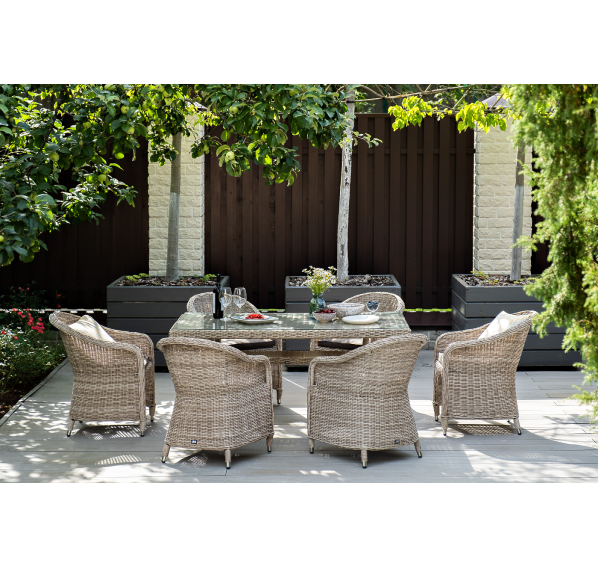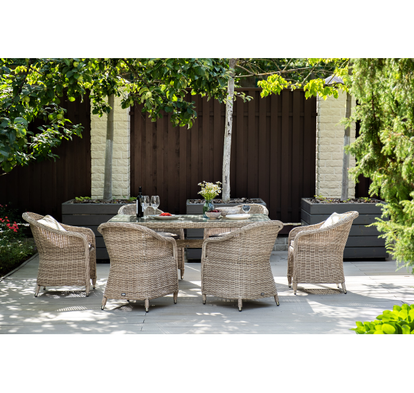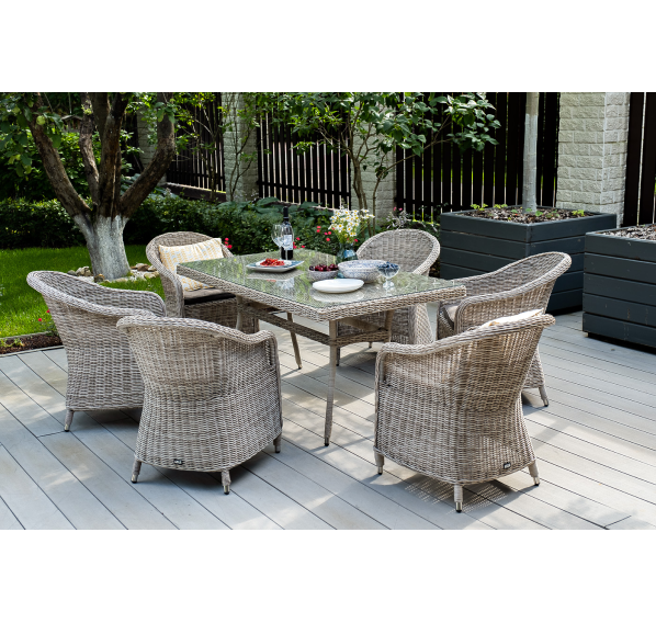 Каркас всех предметов мебели изготовлен из легкого и прочного алюминия, оплетенного вручную искусственным ротангом. Стол для удобства использования накрыт прочным стеклом, кресла укомплектованы подушками со съёмными чехлами серого цвета.