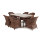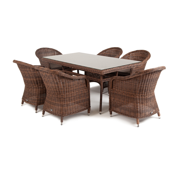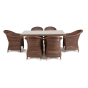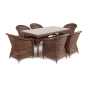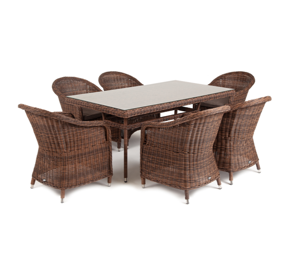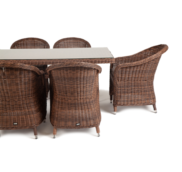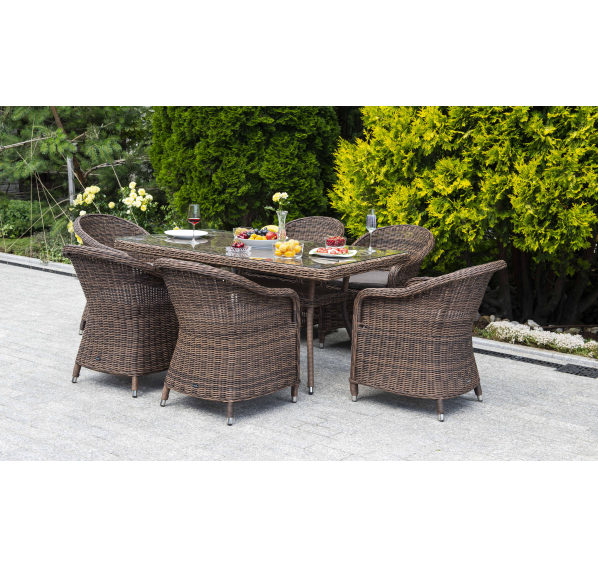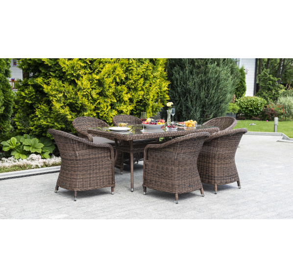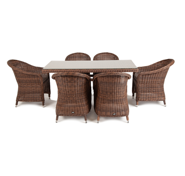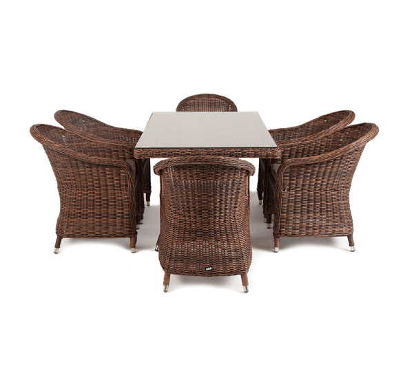 Премиальная обеденная группа для сада, веранды ресторана «Эспрессо» для большой компании. В набор входит большой прямоугольный стол «Латте», размером - 1600×900×750 мм и 6 кресел «Равенна», размер - 570×680×810 мм, в насыщенном коричневом оттенке.