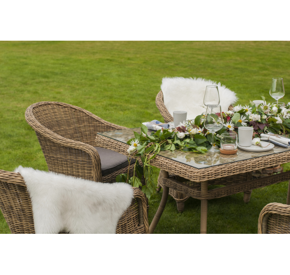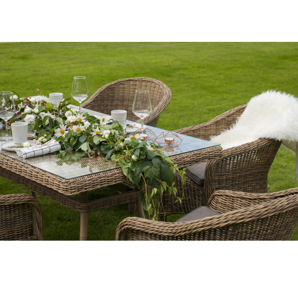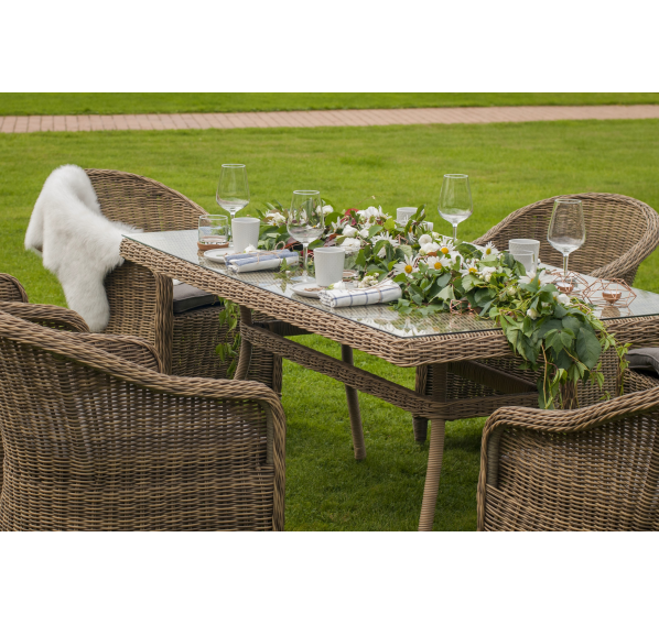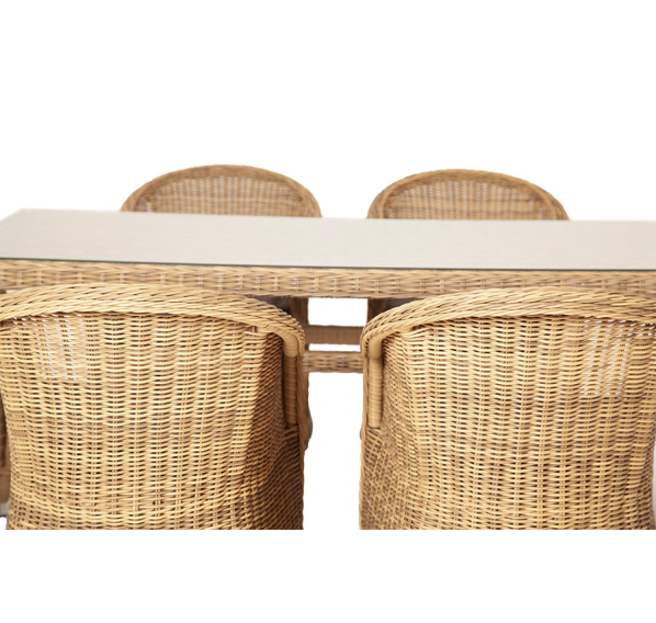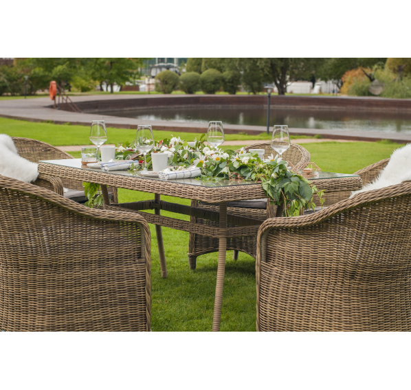 Стеклянная столешница, толщиной 5 мм, идет в комплекте со столом. Подушки на плетеных стулья со съёмными чехлами и водоотталкивающей пропиткой.