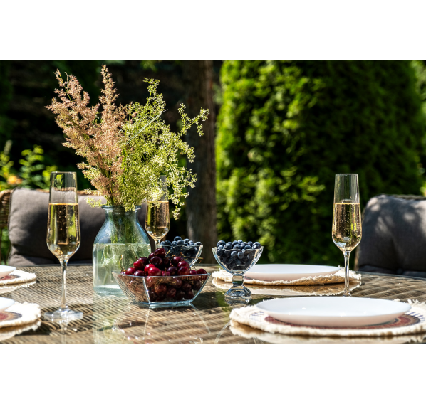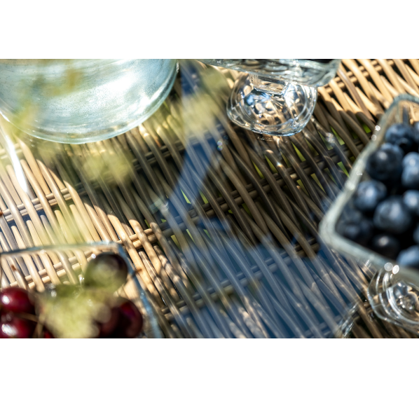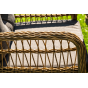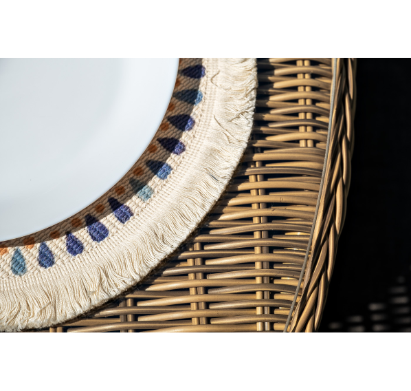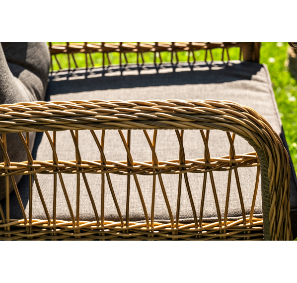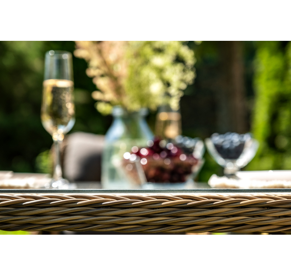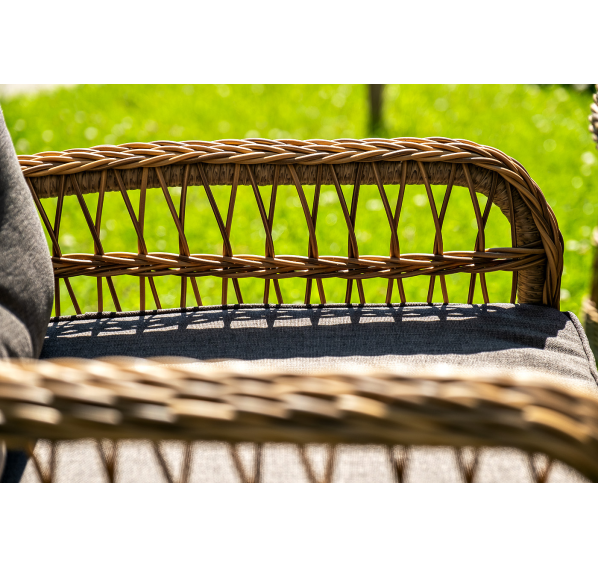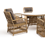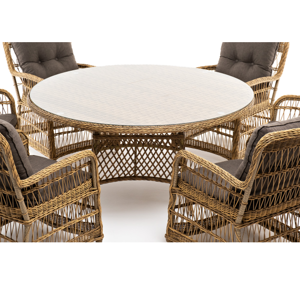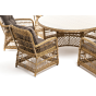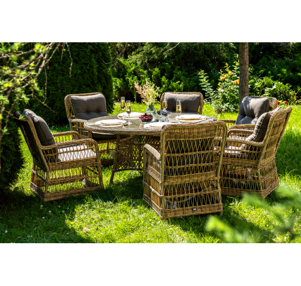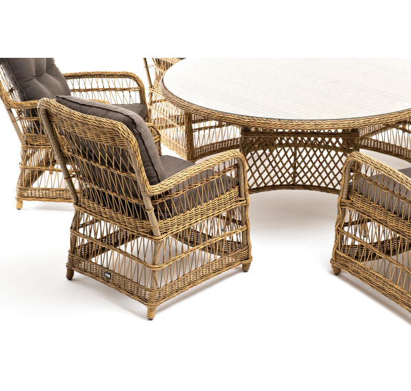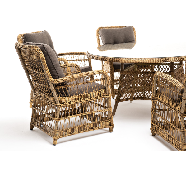 Вся мебель изготовлена из долговечного и легкого алюминия, обтянутого синтетическим ротангом. На столе для удобства эксплуатации предусмотрена столешница из ударопрочного закаленного стекла 5 мм. Стулья укомплектованы подушками на сидениях и на спинках.