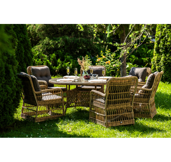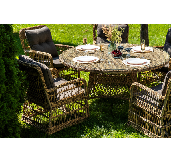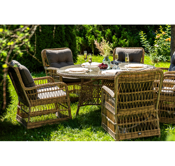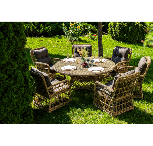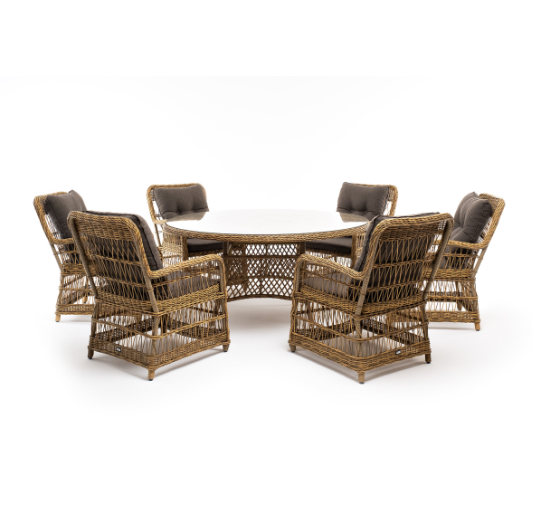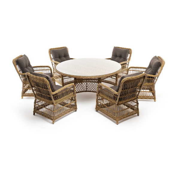 Обеденная группа на 6 персон «Эспрессо» из ротанга. В комплекте: большой круглый обеденный стол (1500×1500×750 мм.) и 6 кресел «Цесена» (600×800×910 мм).