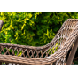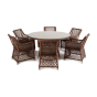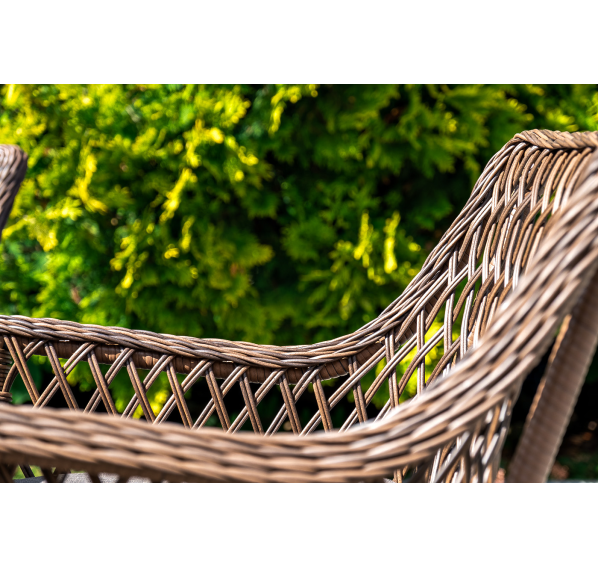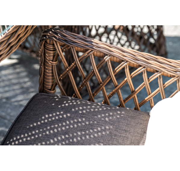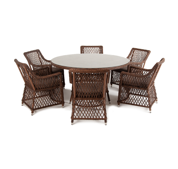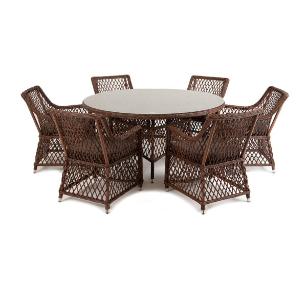 Вся мебель изготовлена из долговечного и легкого алюминия, обтянутого синтетическим ротангом. На столе для удобства эксплуатации предусмотрена столешница из ударопрочного закаленного стекла 5 мм. Стулья укомплектованы подушками на сидениях.