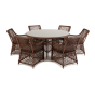 В комплекте круглый обеденный стол «Эспрессо» (1500×1500×750 мм) с ударопрочной стеклянной столешницей и 6 кресел коллекции «Латте» 550×660×850 мм.