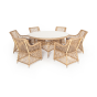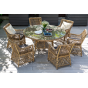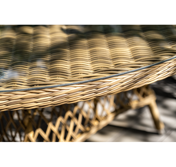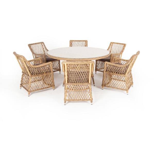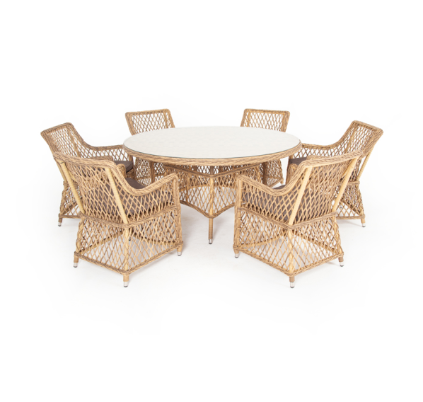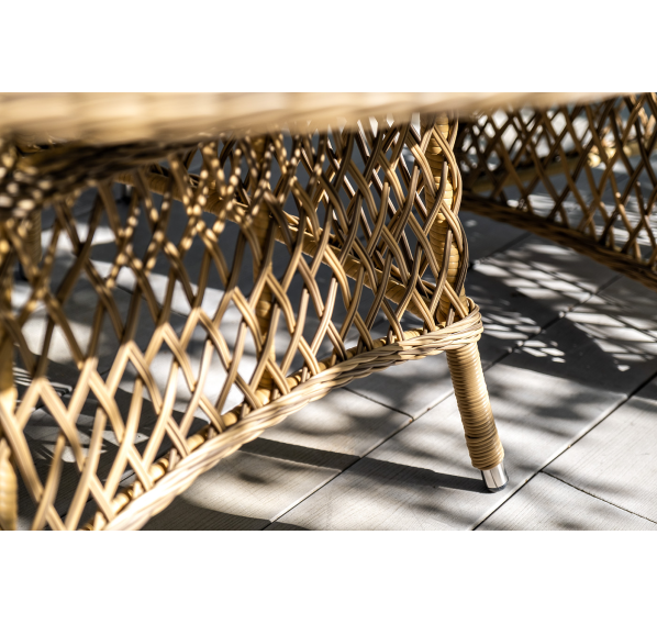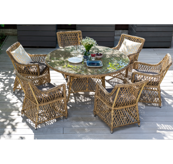 Вся мебель изготовлена из долговечного и легкого алюминия, обтянутого синтетическим ротангом. На столе для удобства эксплуатации предусмотрена столешница из ударопрочного закаленного стекла 5 мм. Стулья укомплектованы подушками на сидениях.
