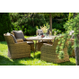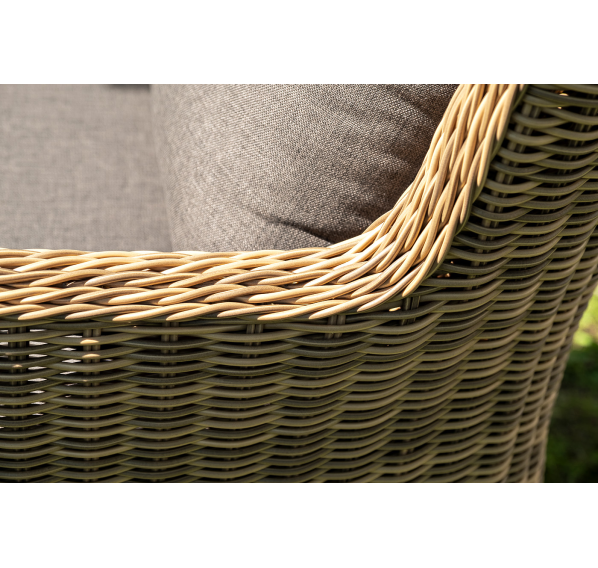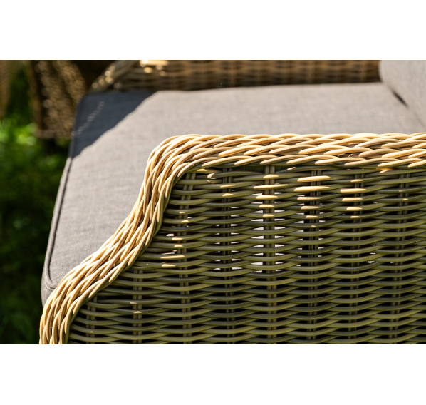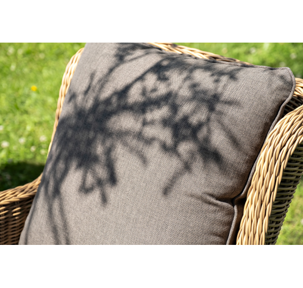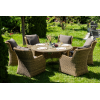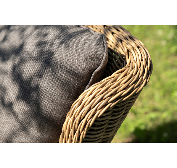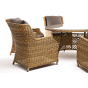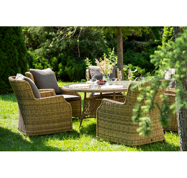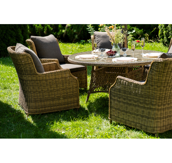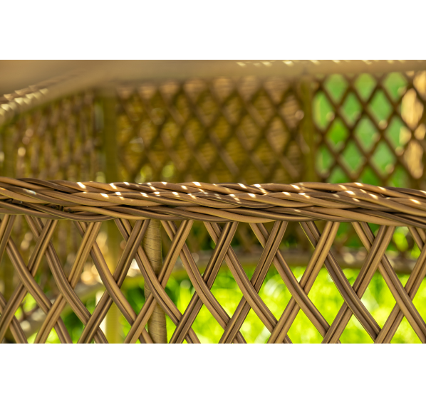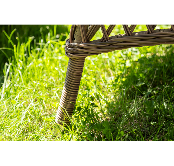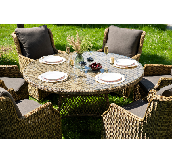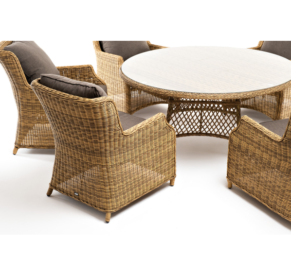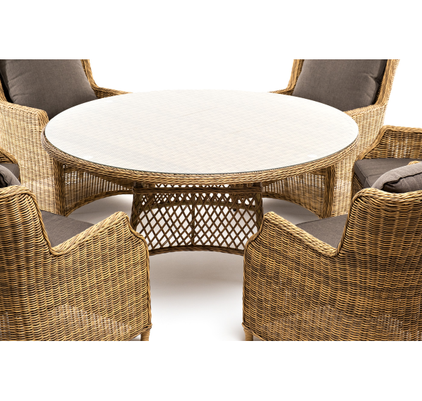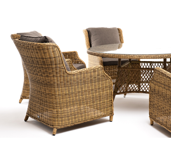 Вся мебель изготовлена из долговечного и легкого алюминия, обтянутого синтетическим ротангом. На столе для удобства эксплуатации предусмотрена столешница из ударопрочного закаленного стекла 5 мм. Стулья укомплектованы подушками на сидениях и на спинках.