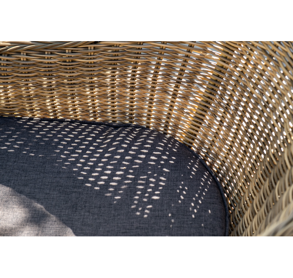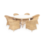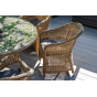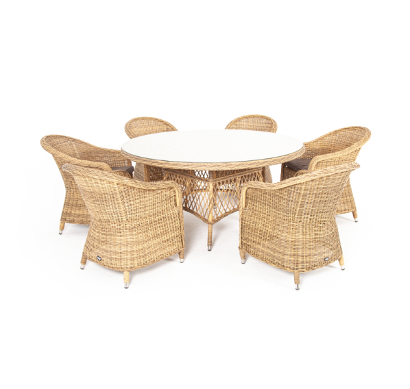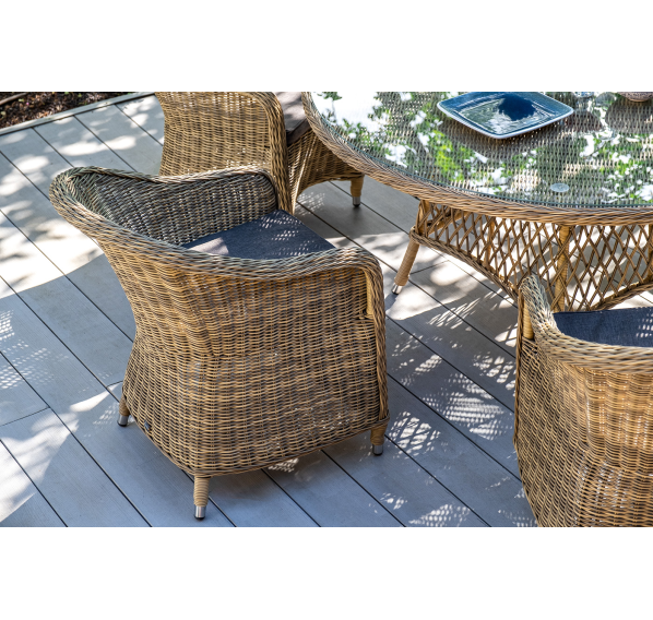 Вся мебель изготовлена из долговечного и легкого алюминия, обтянутого синтетическим ротангом. На столе для удобства эксплуатации предусмотрена столешница из ударопрочного закаленного стекла 5 мм. Стулья укомплектованы подушками на сидениях.