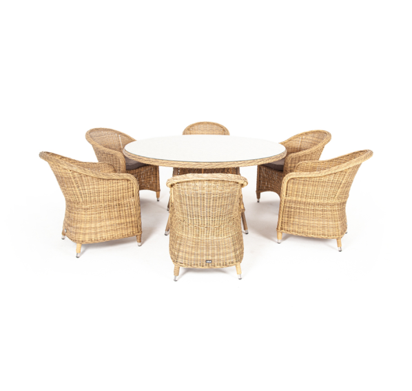 В комплект входит круглый обеденный стол «Эспрессо» (1500×1500×750 мм) с ударопрочной стеклянной столешницей и 6 кресел коллекции «Равенна» 570×680×810 мм.