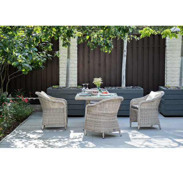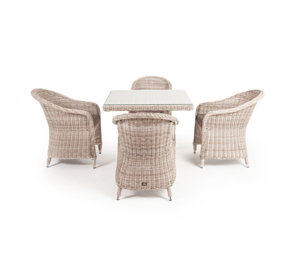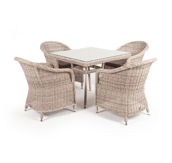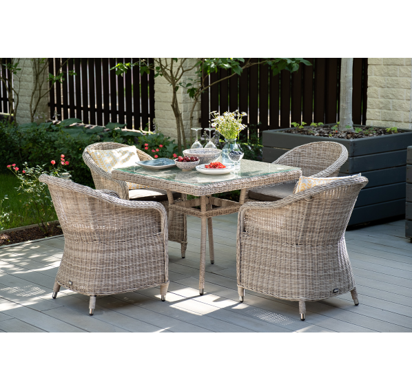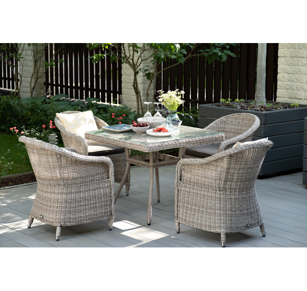 Обеденная группа «Фредо» для сада, веранды, летней площадки ресторана. В набор входит квадратный стол «Айриш» (900×900×750 мм) и 4 кресла «Равенна» (570×680×810 мм) в натуральном бежевом оттенке.