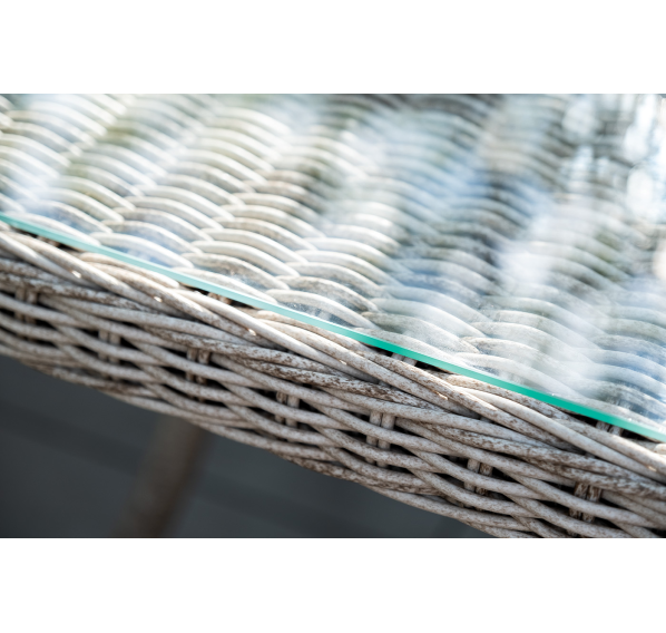 Каркас мебели выполнен из легкого и долговечного алюминия, оплетенного вручную синтетической ротанговой лозой. Кресла идут с подушками в комплекте. Материал столешницы – ударопрочное стекло 5 мм.