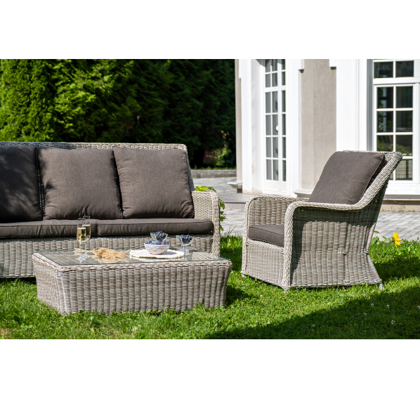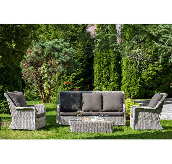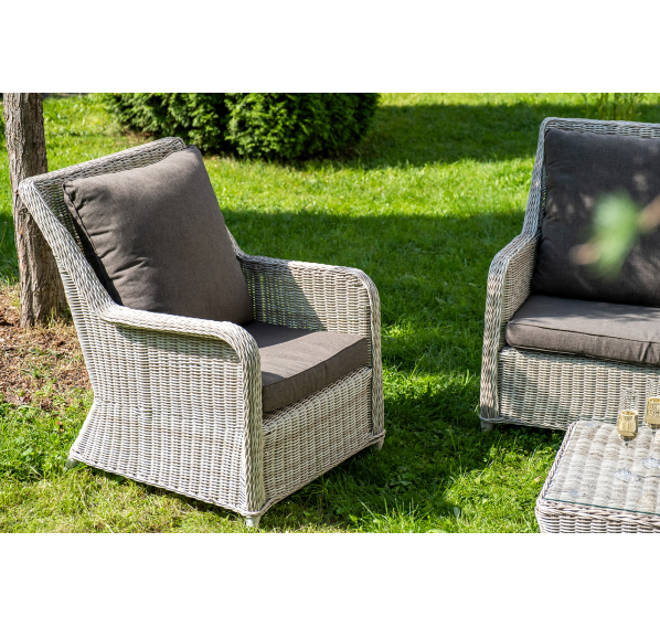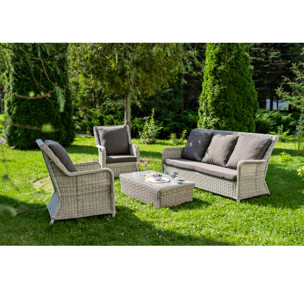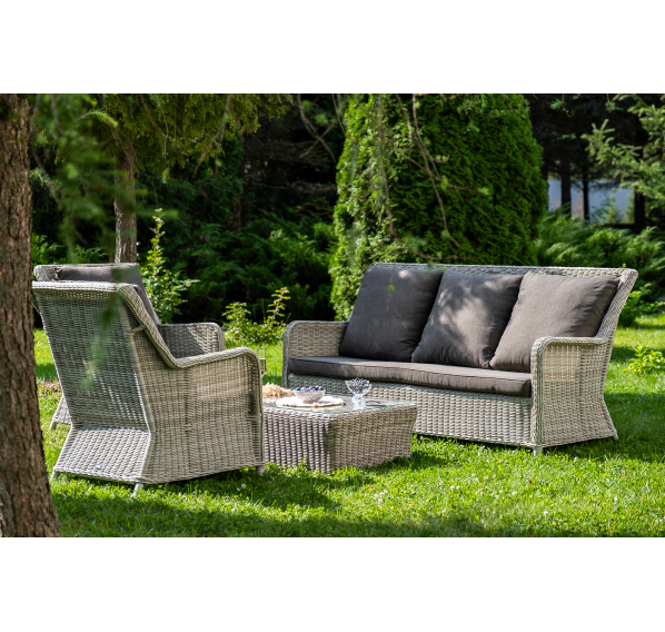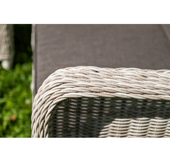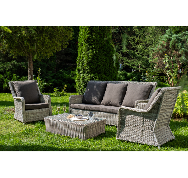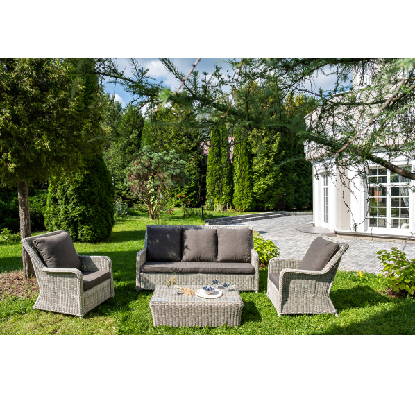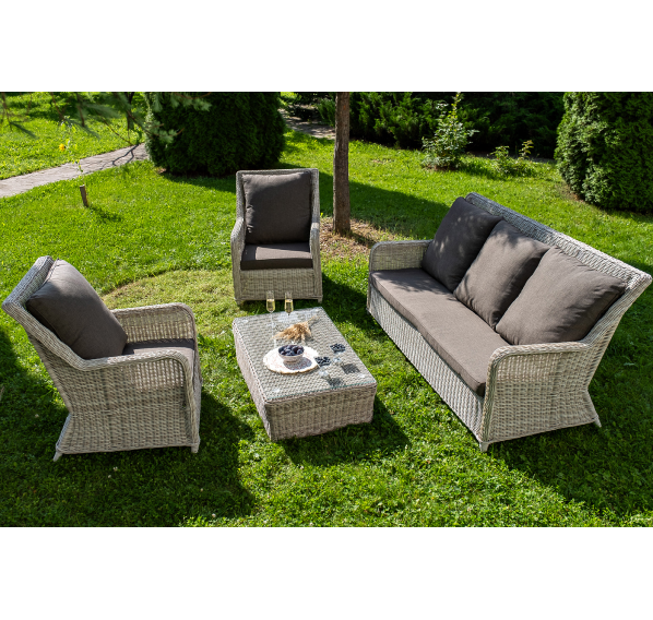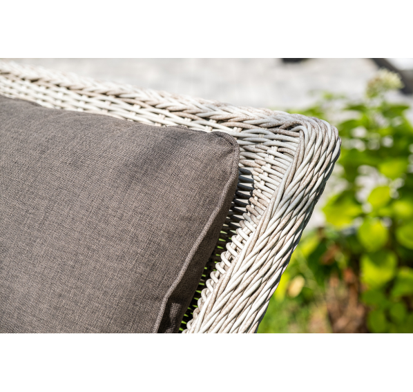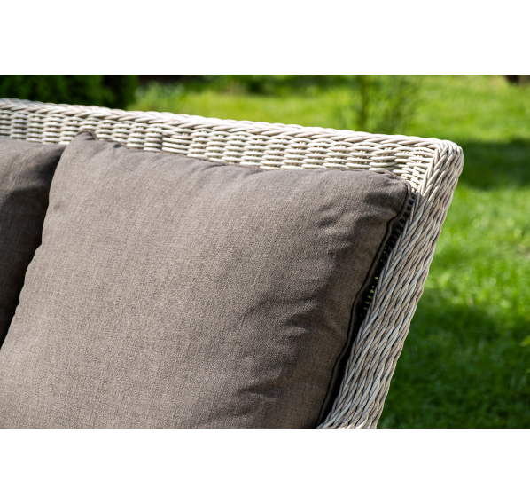 Плетеная мебель дополнена удобными подушками в серых чехлах. При их изготовлении используют полиэстер, плотность – 300гр/м2. Он обрабатывается влагоотталкивающей пропиткой для повышения защитных свойств материала.