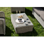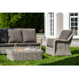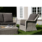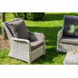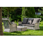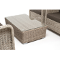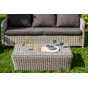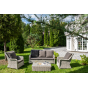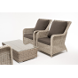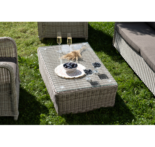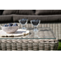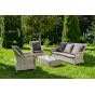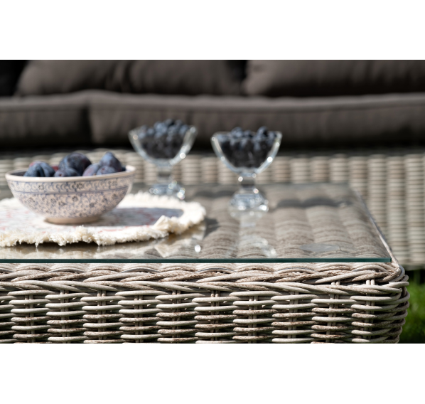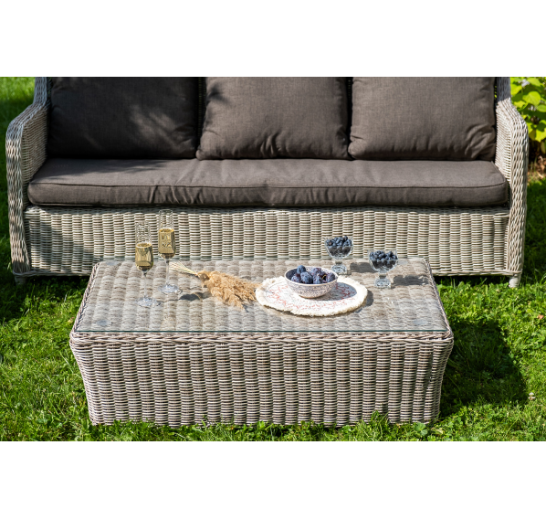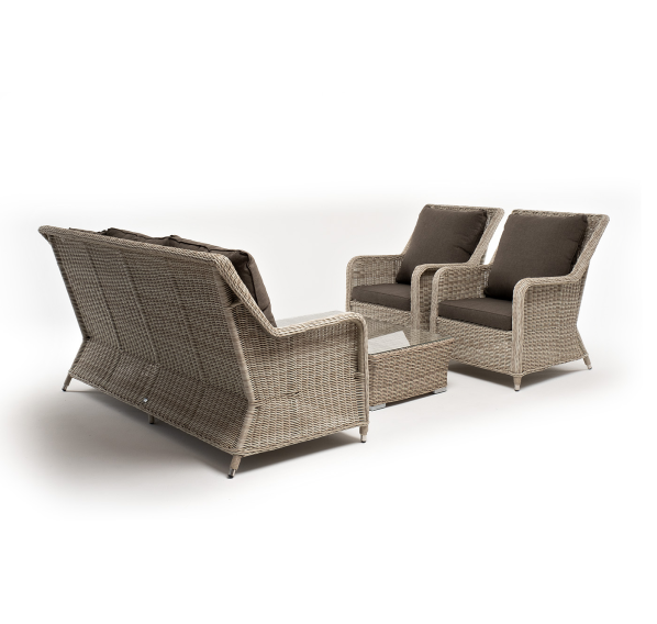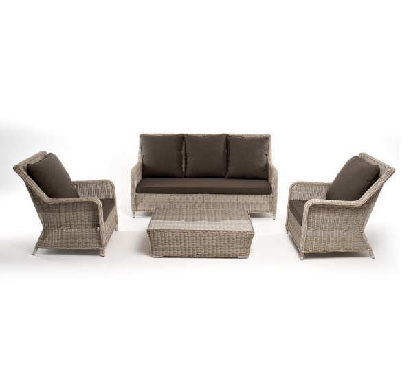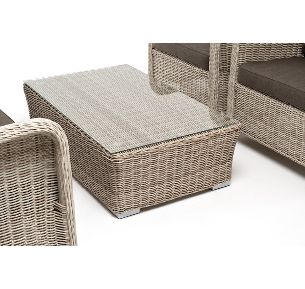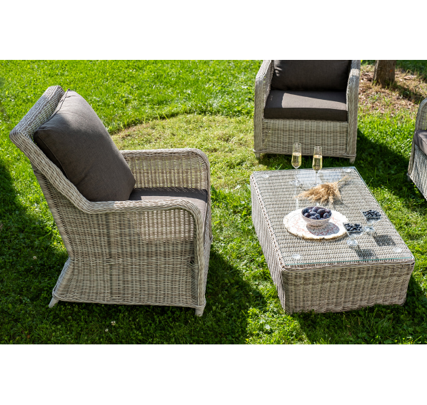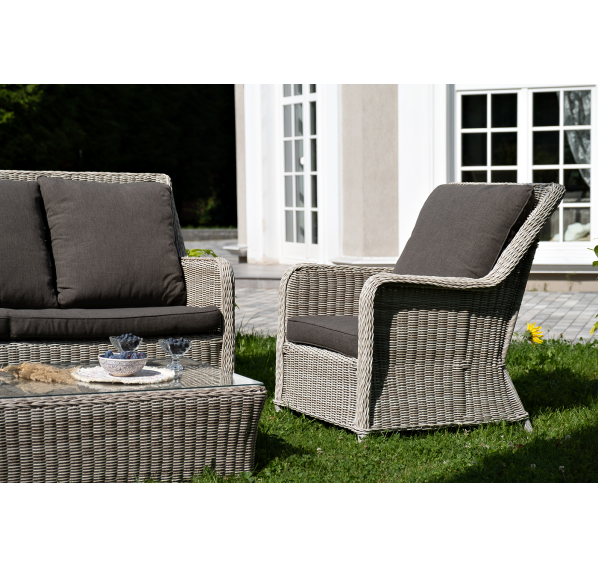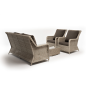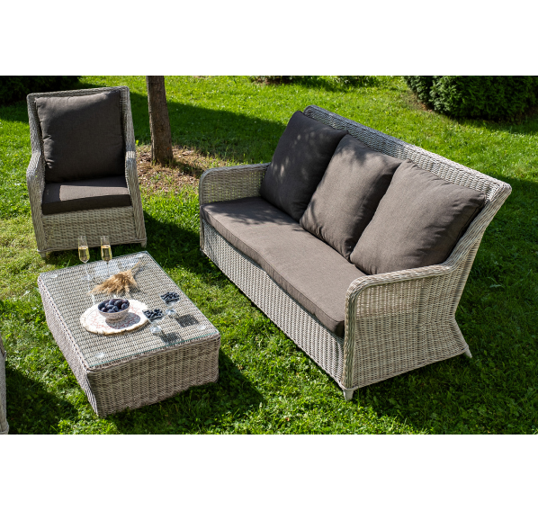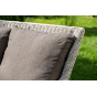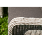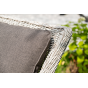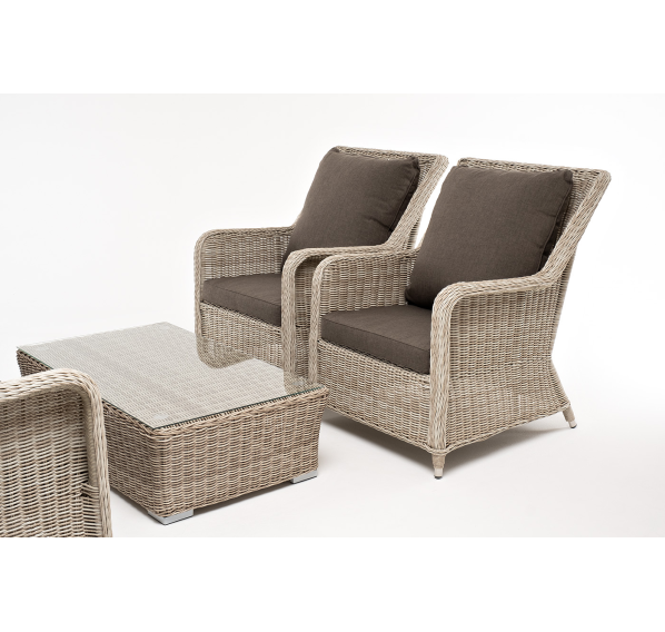 Плетеная мебель дополнена удобными подушками в серых чехлах. При их изготовлении используют полиэстер, плотность – 300гр/м2. Он обрабатывается влагоотталкивающей пропиткой для повышения защитных свойств материала.