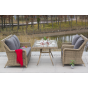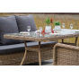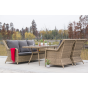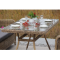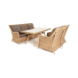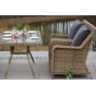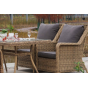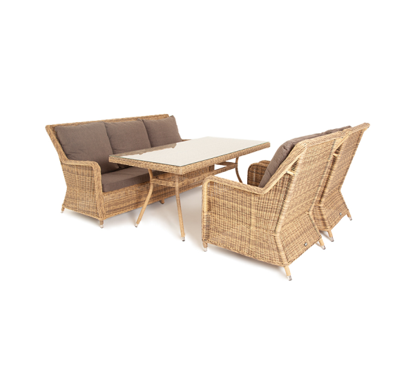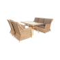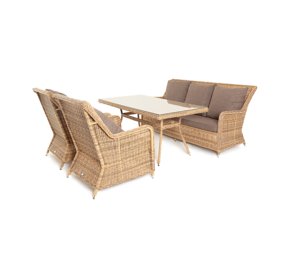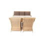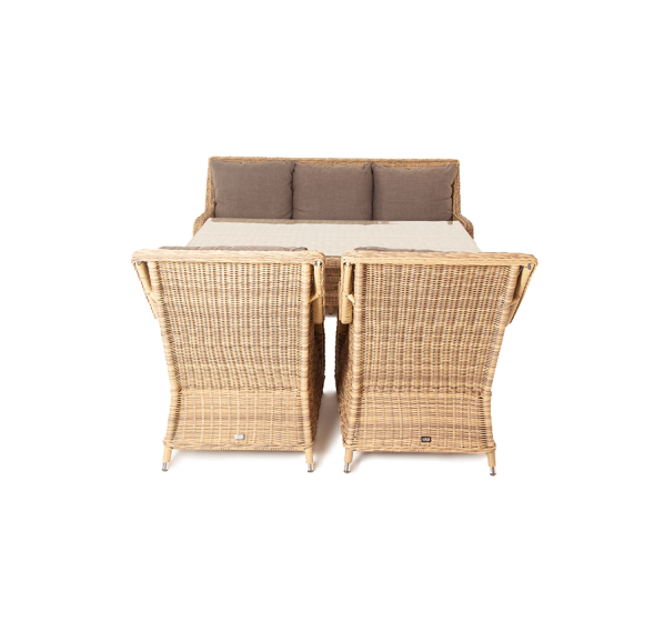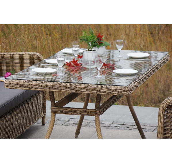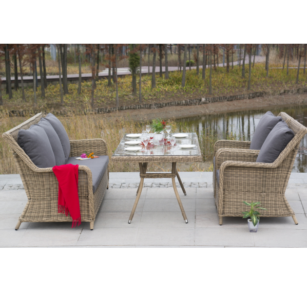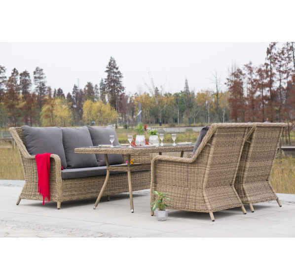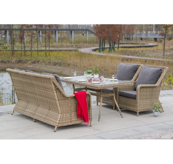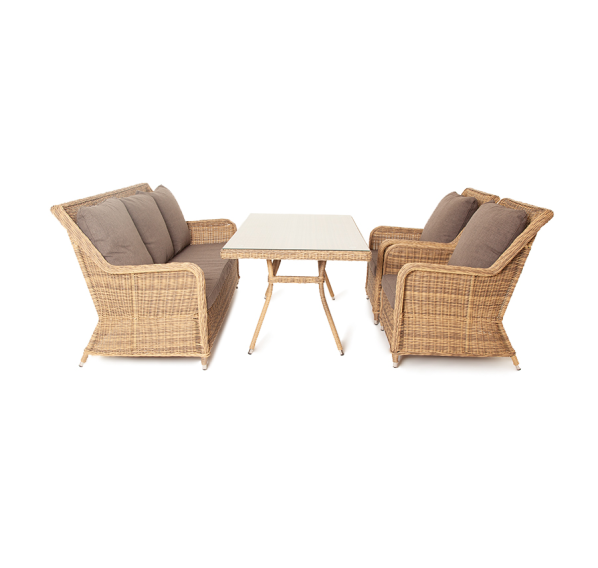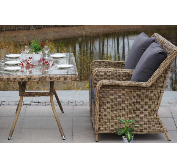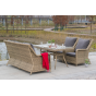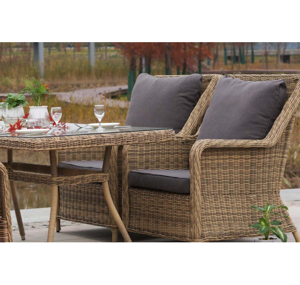 Каркас мебели алюминиевый. Он оформлен с помощью искусственного ротанга круглой формы и был оплетен ручным способом. Цвет плетение - соломенный.