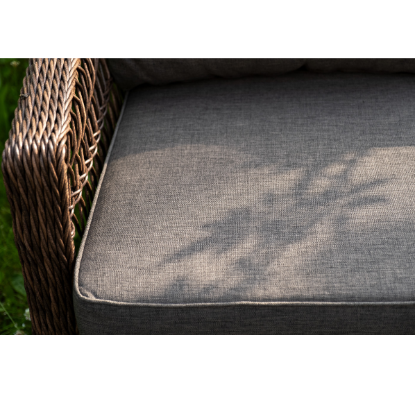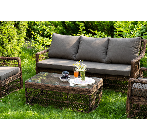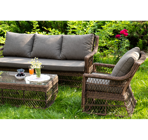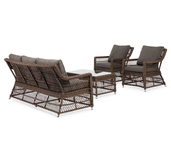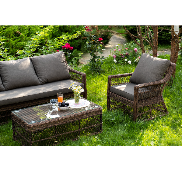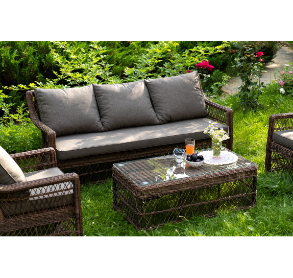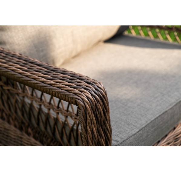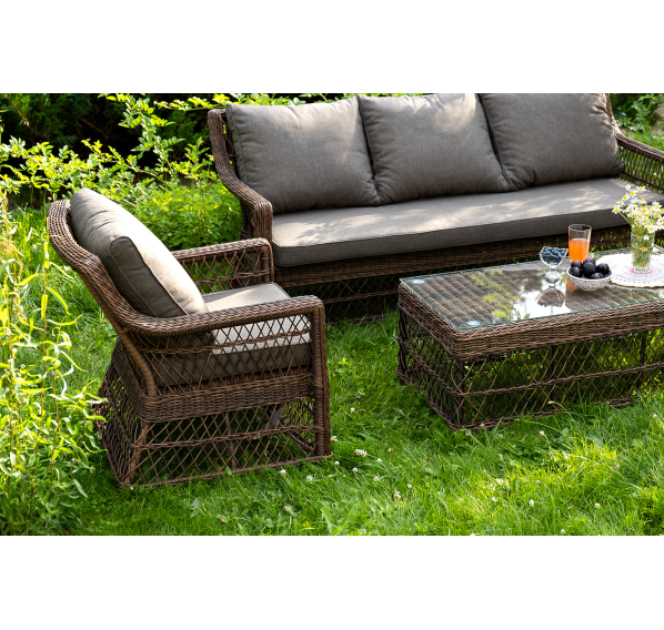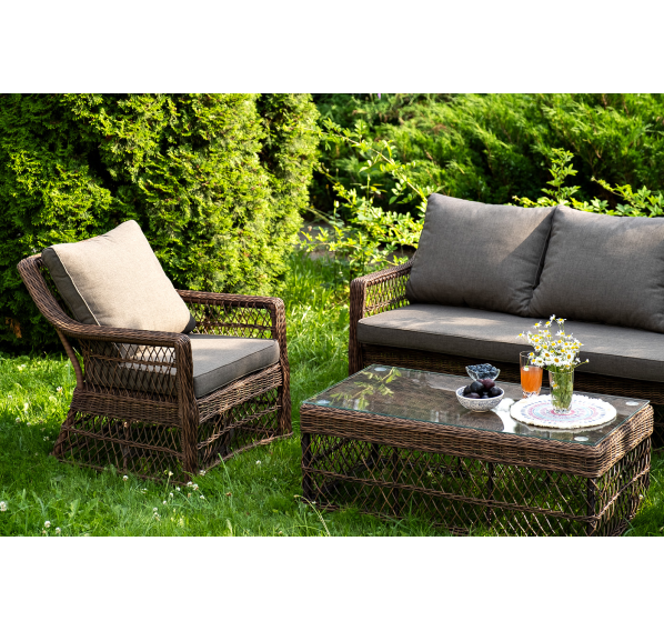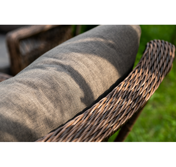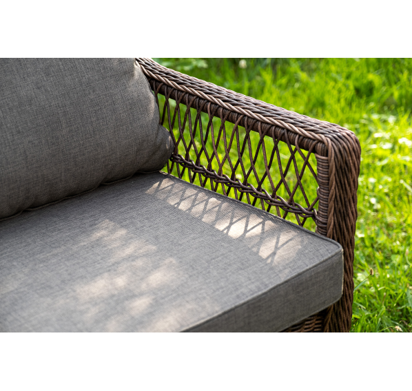 Уличная мебель имеет алюминиевый каркас, ручное плетение, сделанное из коричневого искусственного ротанга. Предусмотрены мягкие подушки из полиэстера серого цвета с плотностью 300гр/м2. Они имеет влагоотталкивающую пропитку. Рабочая поверхность столика изготовлена из закаленного стекла толщиной 5 мм.