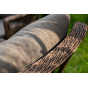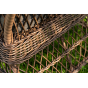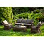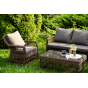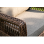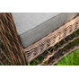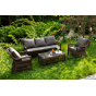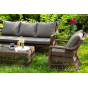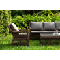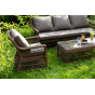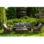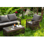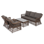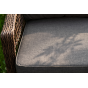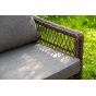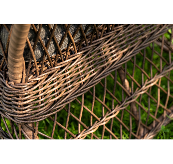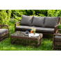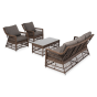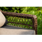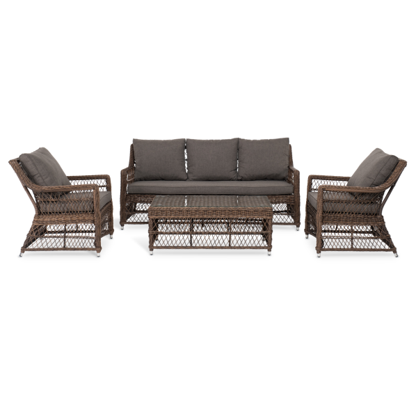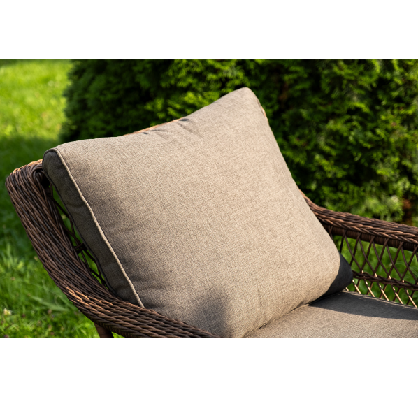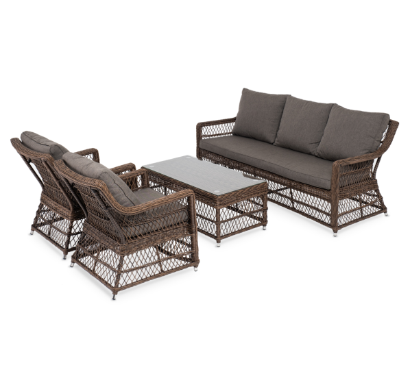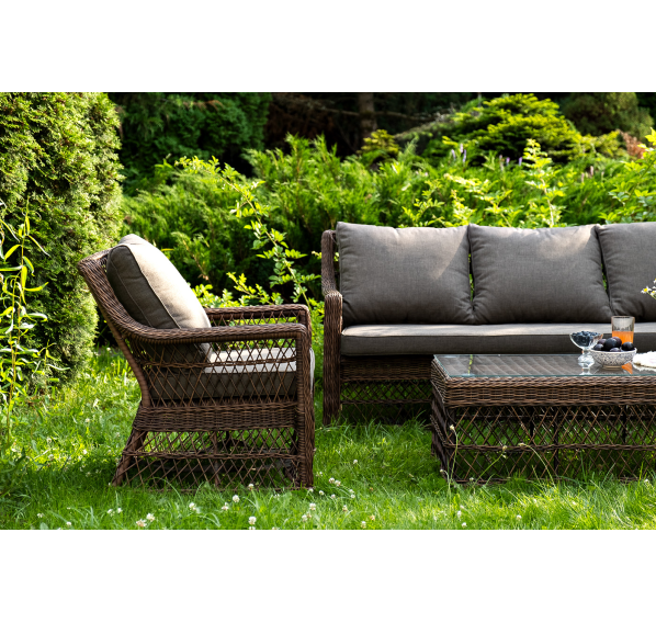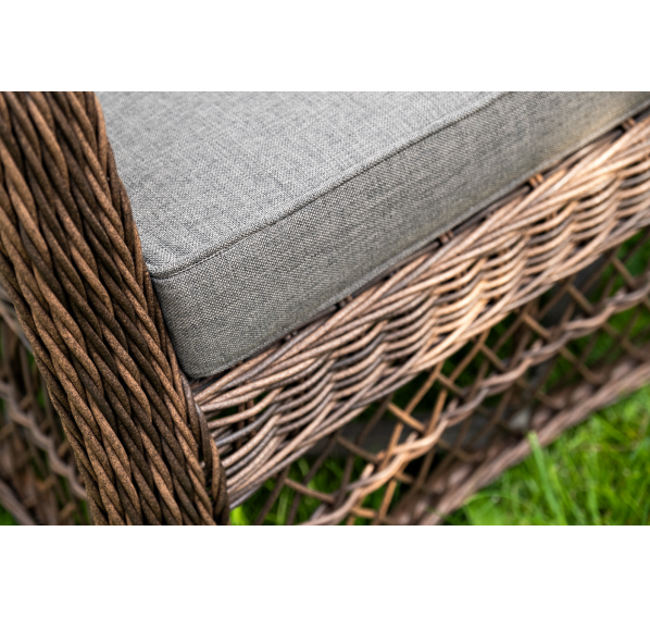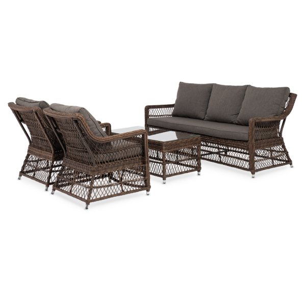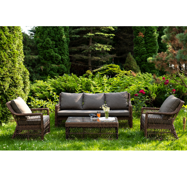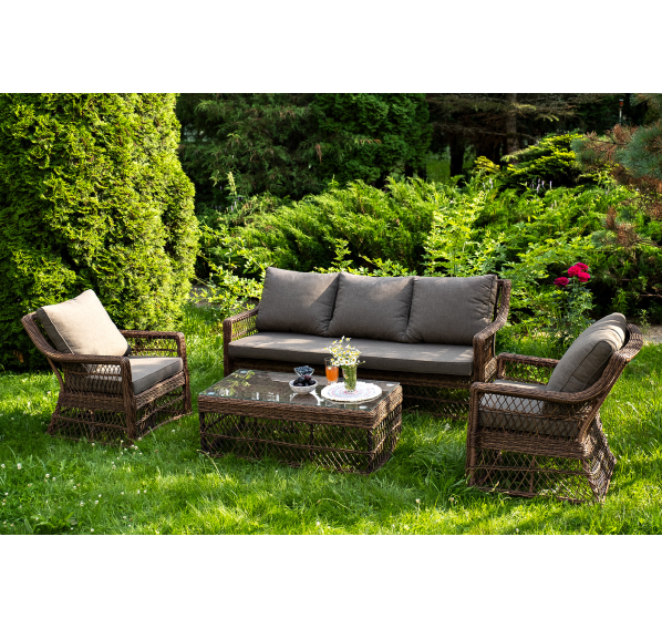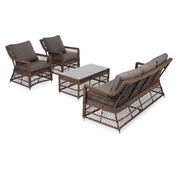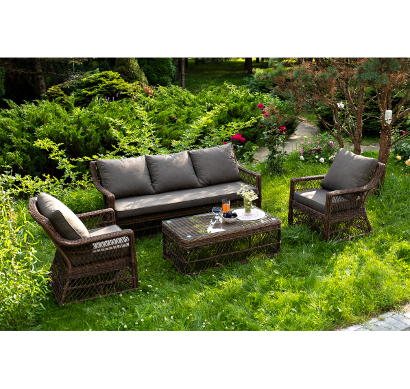 Уличная мебель имеет алюминиевый каркас, ручное плетение, сделанное из коричневого искусственного ротанга. Предусмотрены мягкие подушки из полиэстера серого цвета с плотностью 300гр/м2. Они имеет влагоотталкивающую пропитку. Рабочая поверхность столика изготовлена из закаленного стекла толщиной 5 мм.