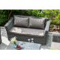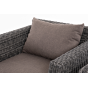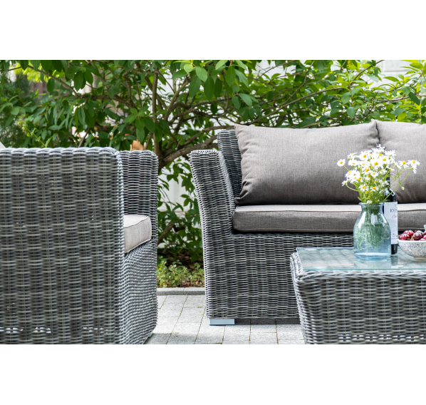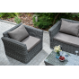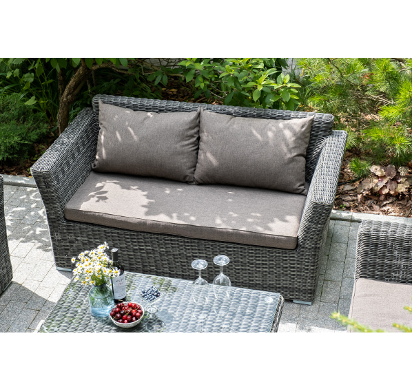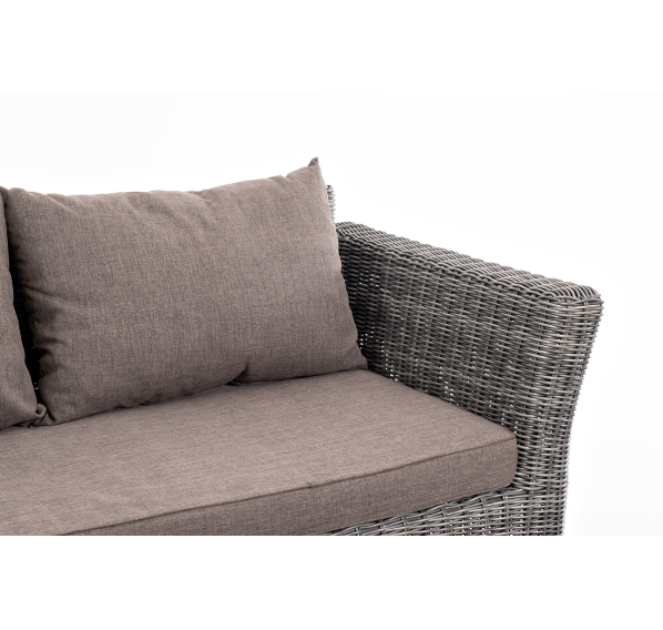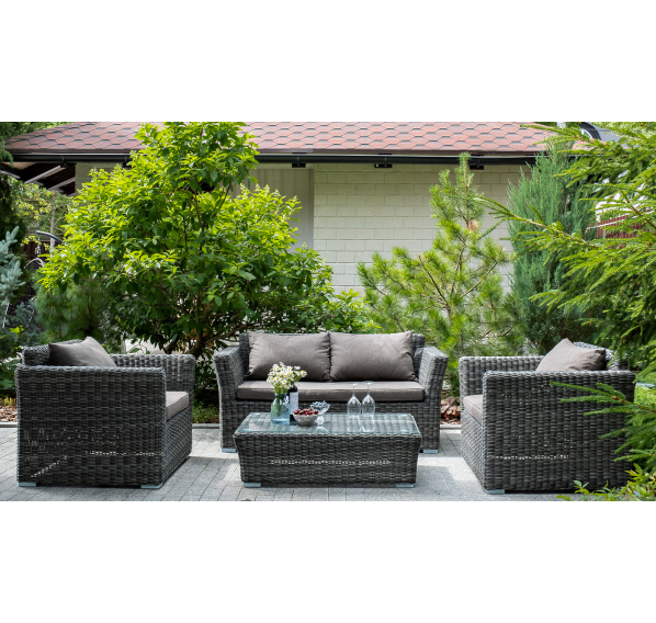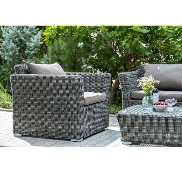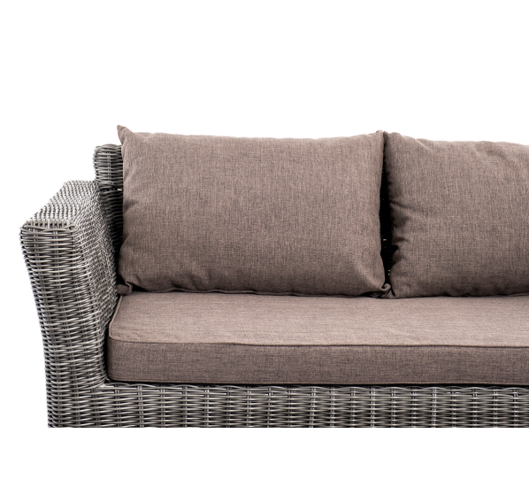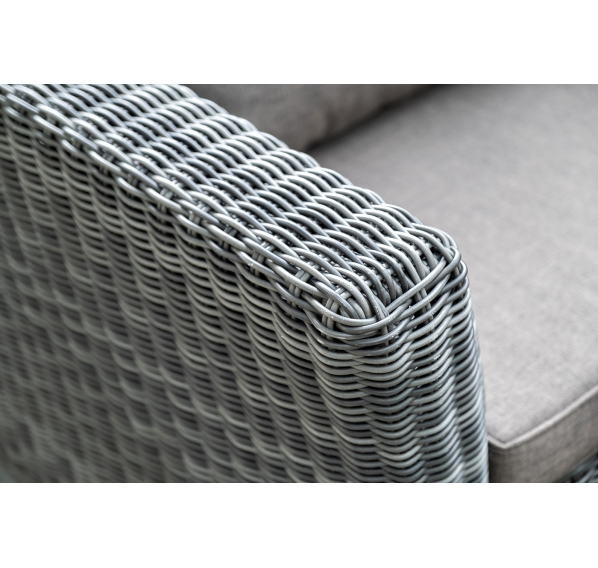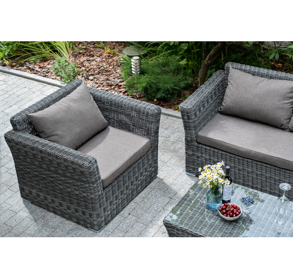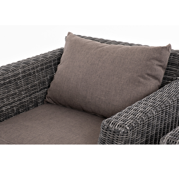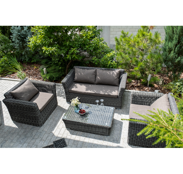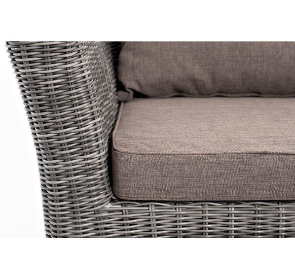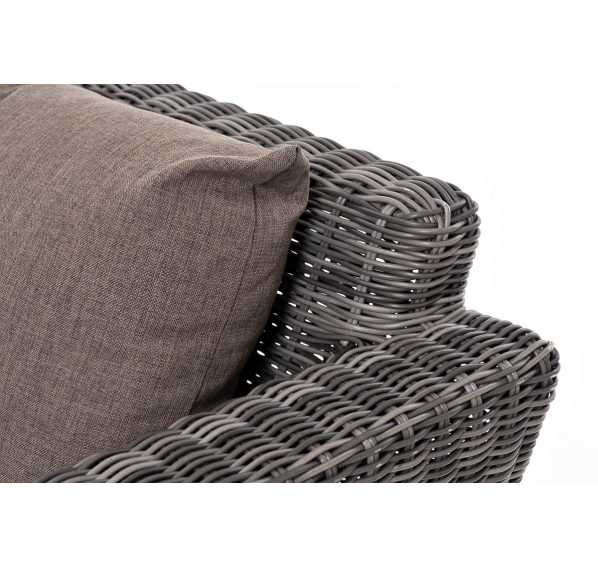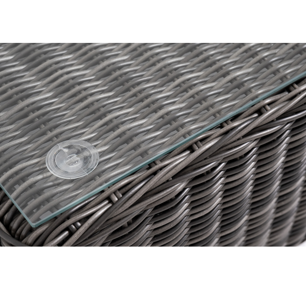 Прочный алюминиевый каркас усиливает устойчивость мебели. Его дополняет плетение в цвете "графит", которое представлено из круглого искусственного ротанга.