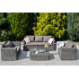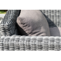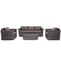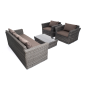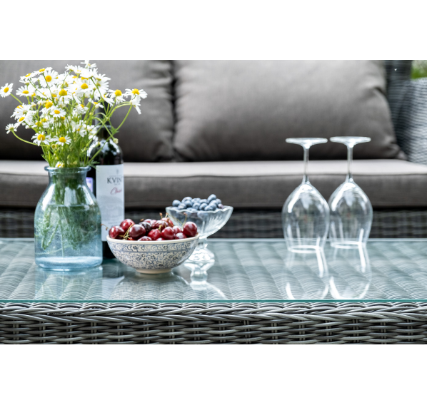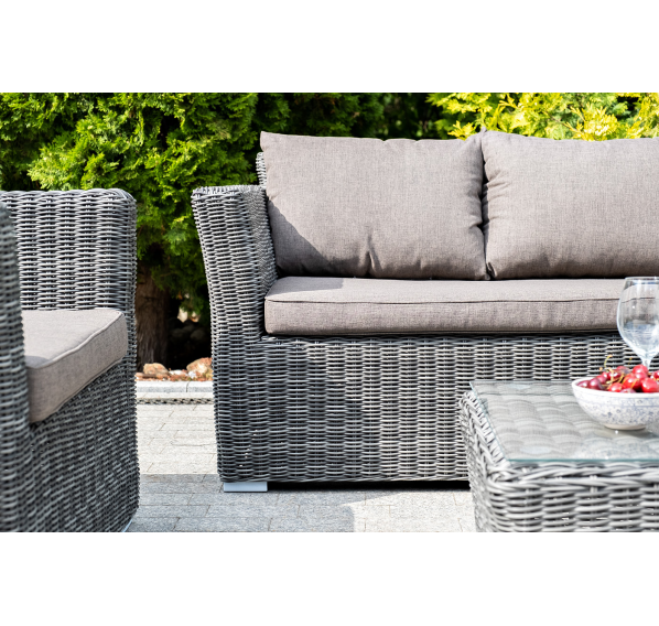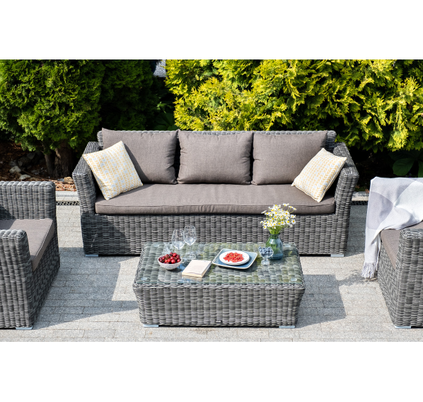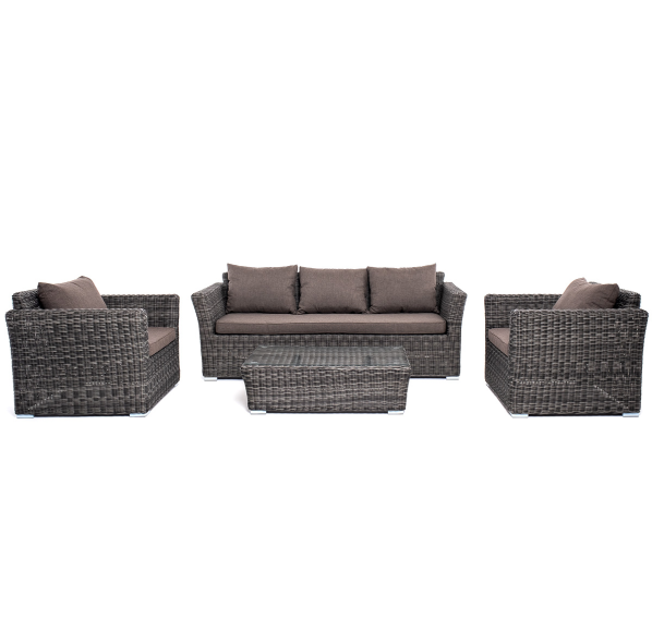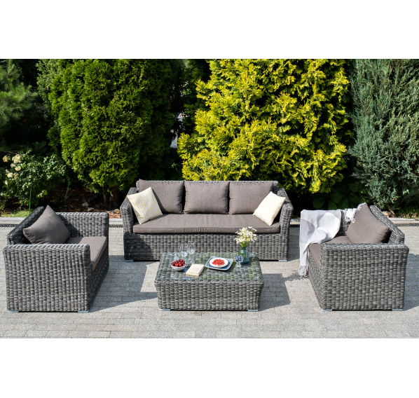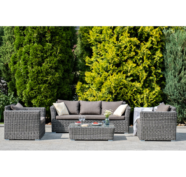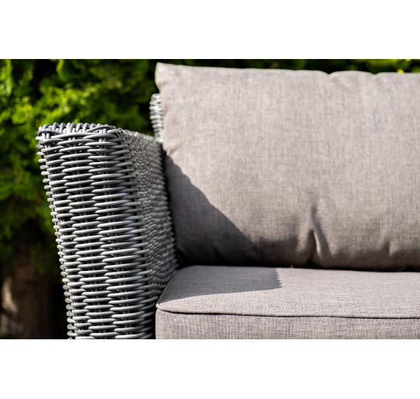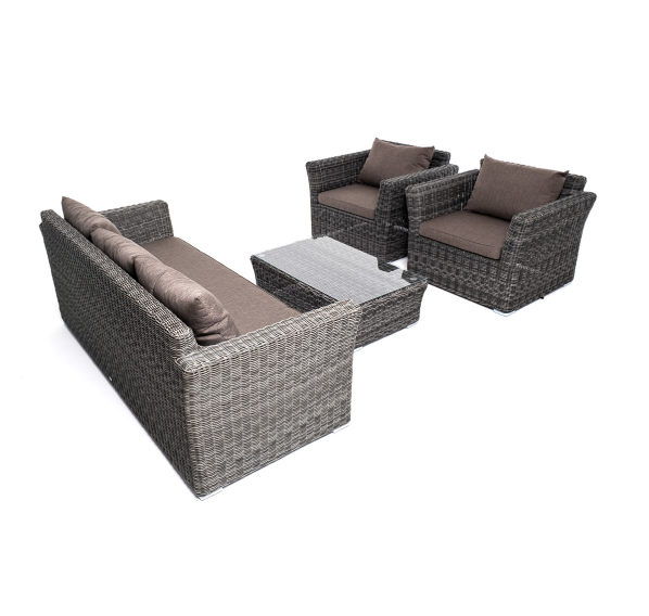 Кресла и диван идут в комплекте с подушками с серыми чехлами. Они пошиты из качественного полиэстера с плотностью 300гр/м2. Материал предварительно проходит обработку влагоотталкивающей пропиткой. Столик дополнен практичной столешницей из стекла толщиной 5 мм.