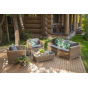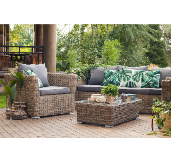 Кресла и диван идут в комплекте с подушками с серыми чехлами. Они пошиты из качественного полиэстера с плотностью 300гр/м2. Материал предварительно проходит обработку влагоотталкивающей пропиткой. Столик дополнен практичной столешницей из стекла толщиной 5 мм.