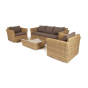Из алюминия сделан устойчивый каркас мебели. Ее поверхность дополнена искусственным ротангом, из которого сделано ручное плетение, цвет соломенный.