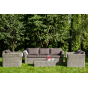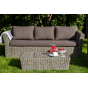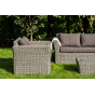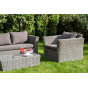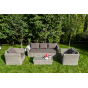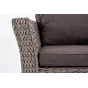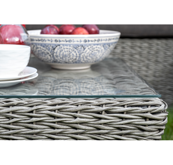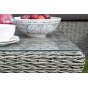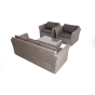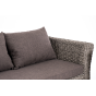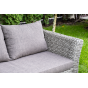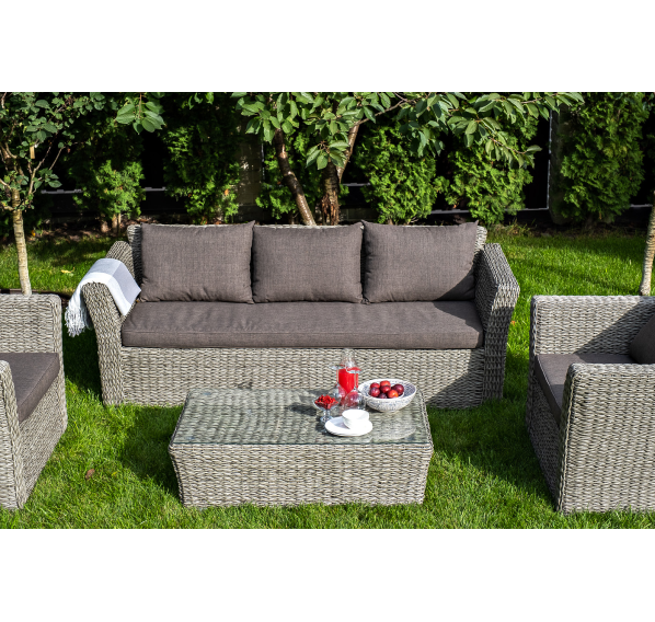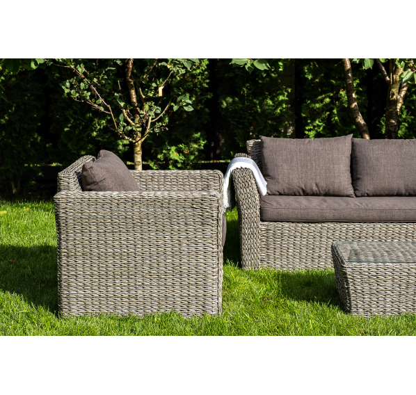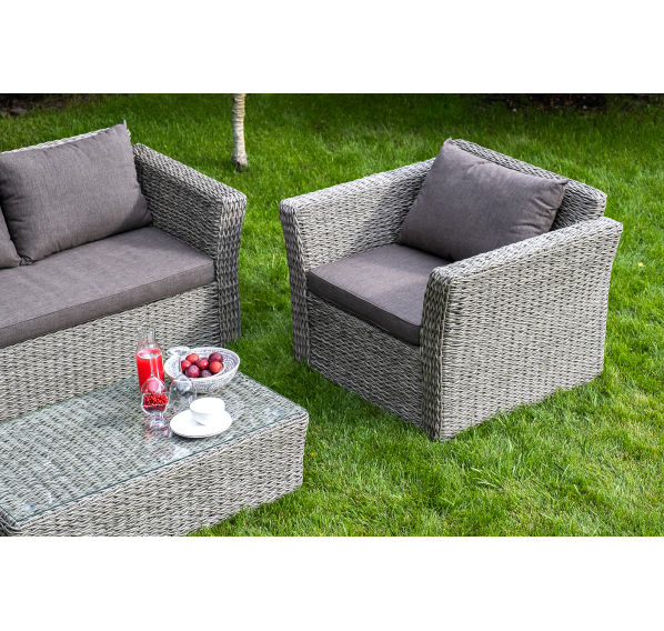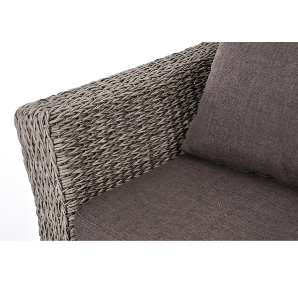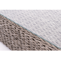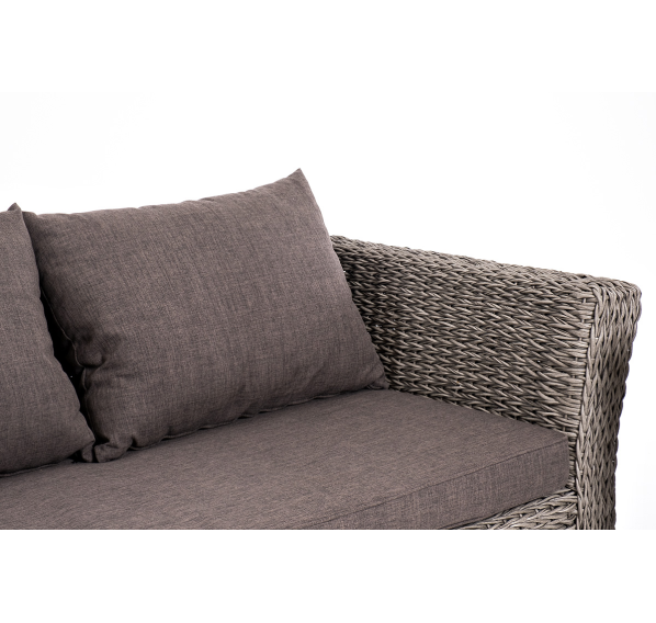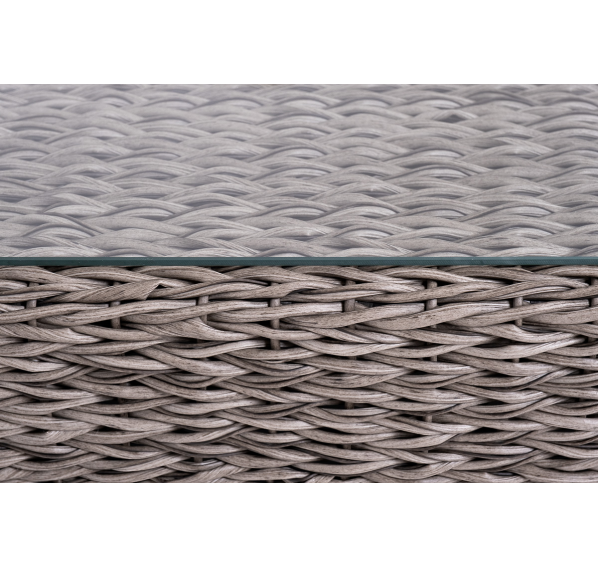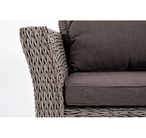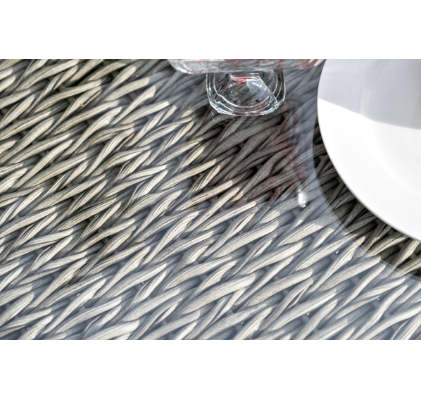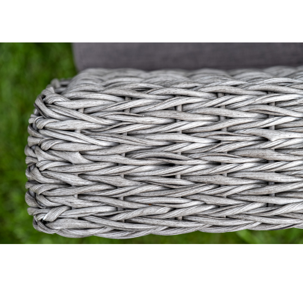 Из алюминия сделан устойчивый каркас мебели. Ее поверхность дополнена искусственным ротангом вида "гиацинт", из которого сделано ручное плетение серого цвета.
