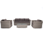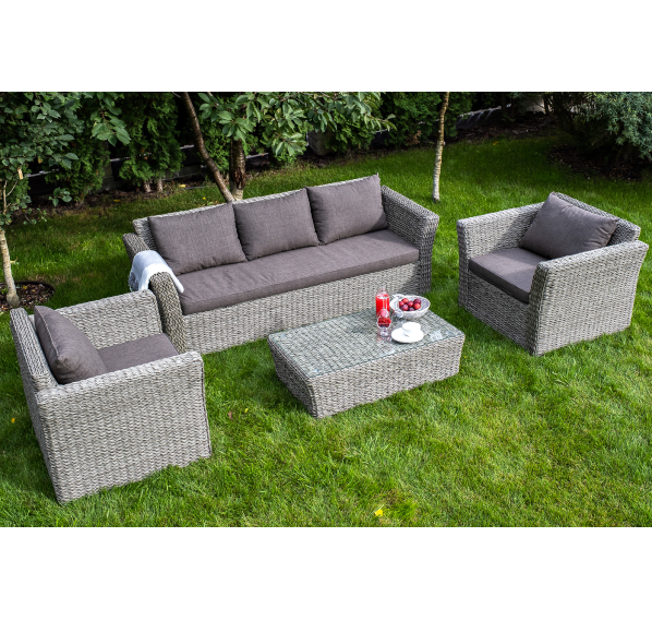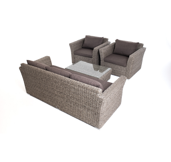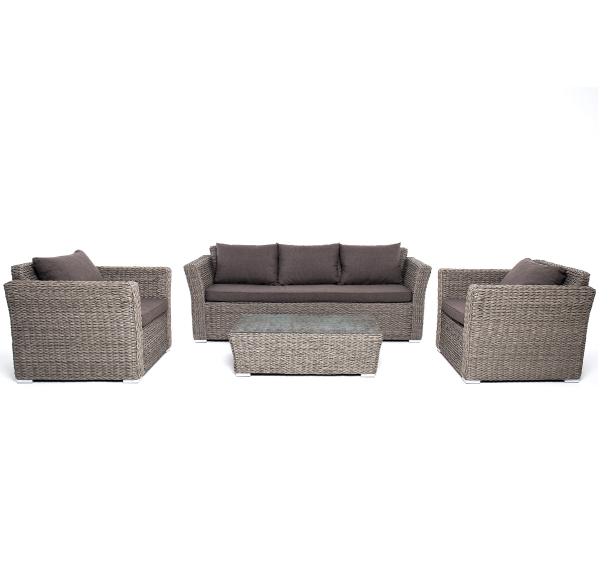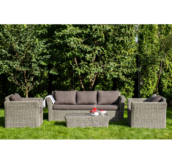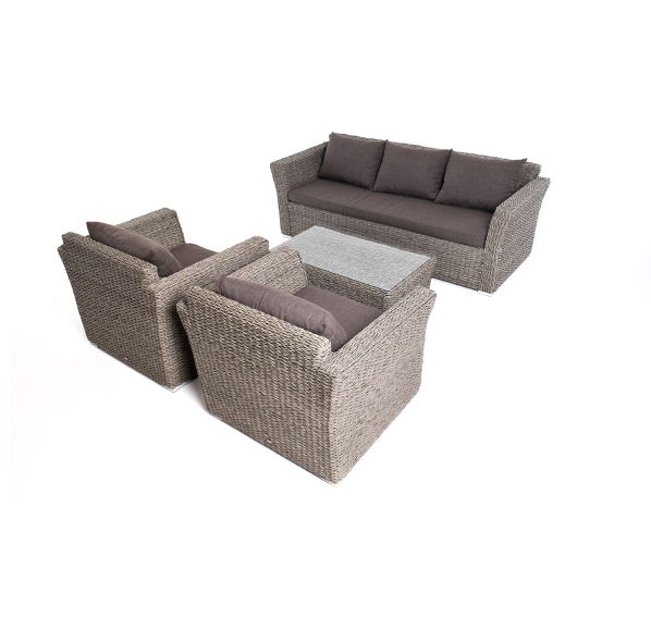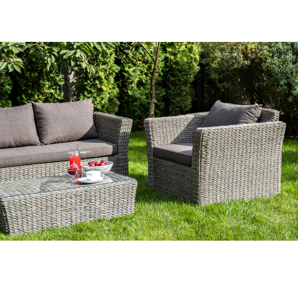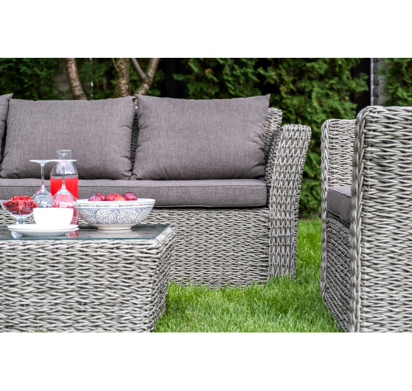 Кресла и диван идут в комплекте с подушками с серыми чехлами. Они пошиты из качественного полиэстера с плотностью 300гр/м2. Материал предварительно проходит обработку влагоотталкивающей пропиткой. Столик дополнен практичной столешницей из стекла толщиной 5 мм.