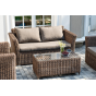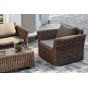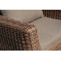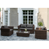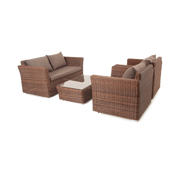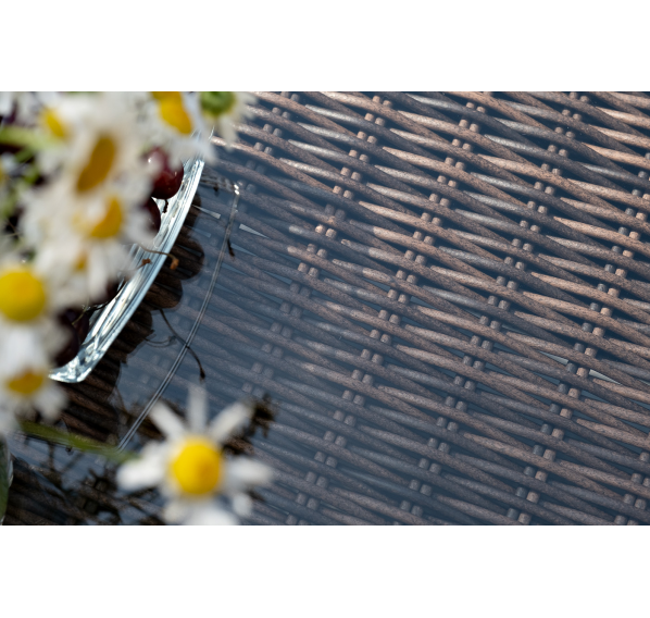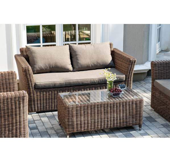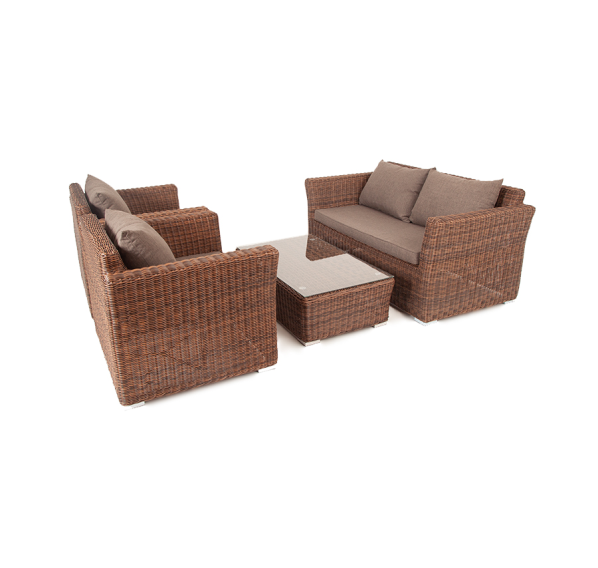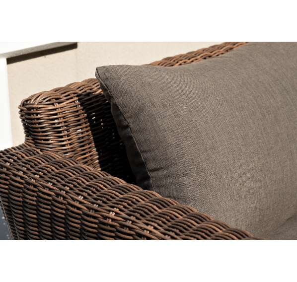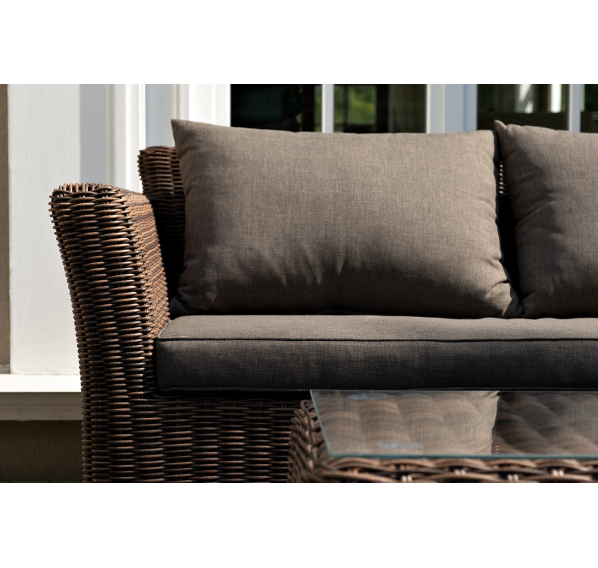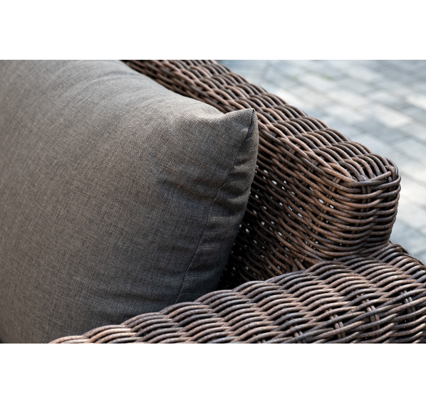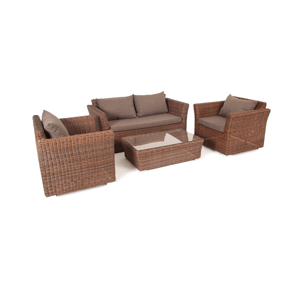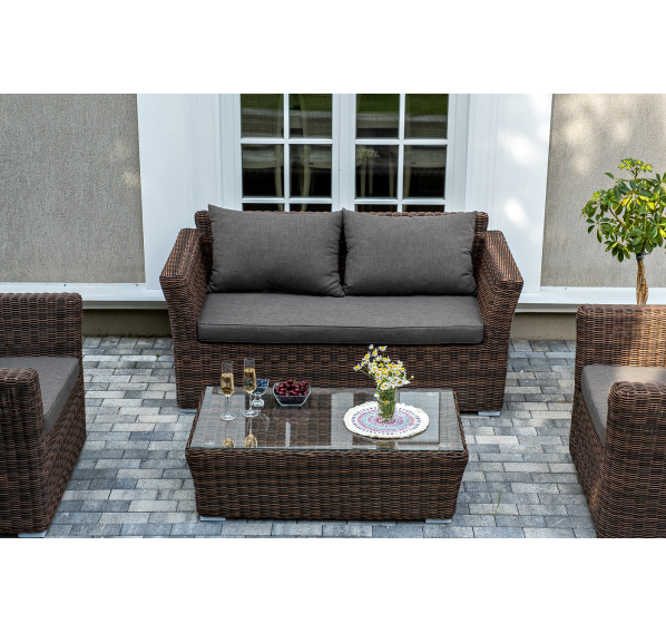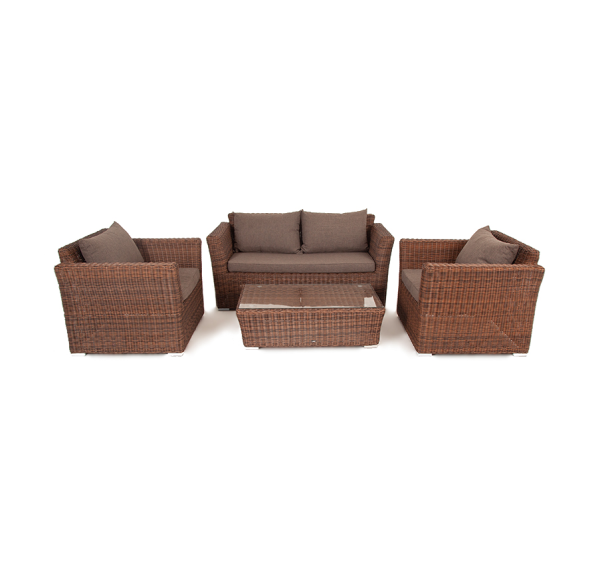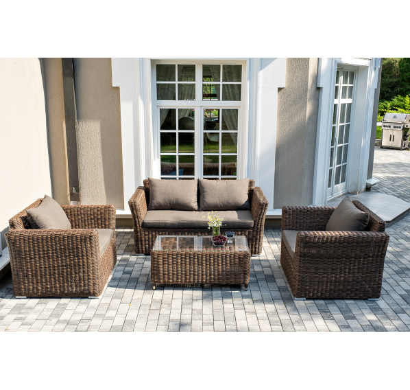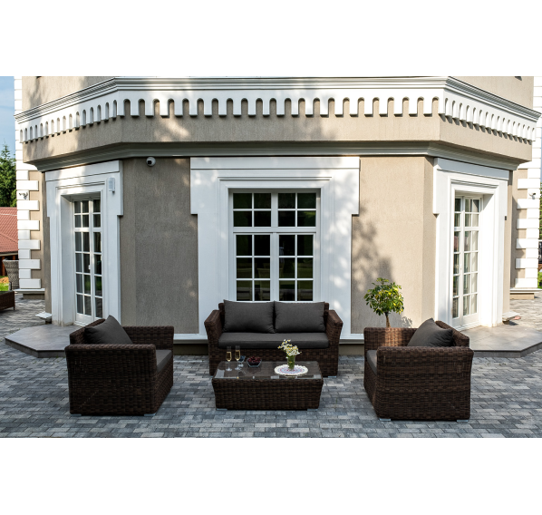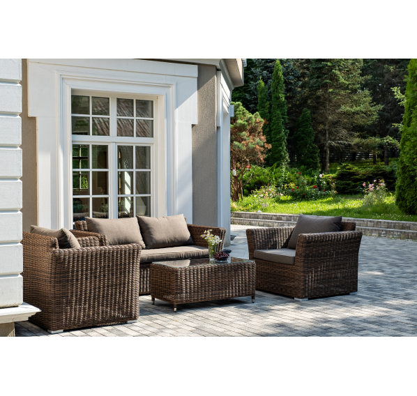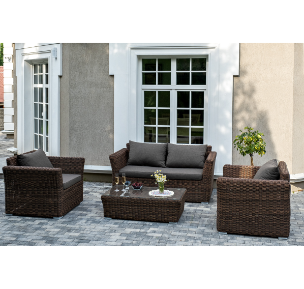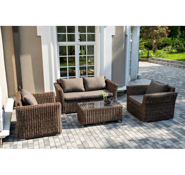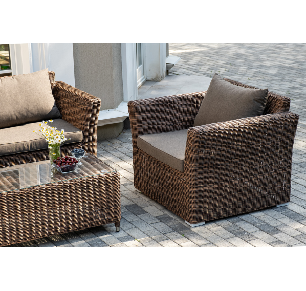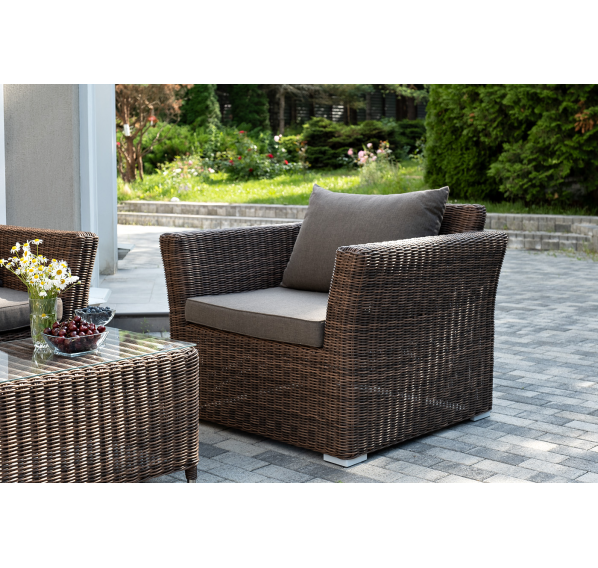 Мебель изготовлена из алюминиевого каркаса и круглого искусственного ротанга, которым вручную оплетается корпус. Цвет комплекта – коричневый.