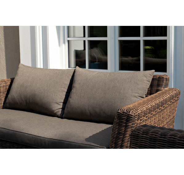 Серые подушки с влагоотталкивающей пропиткой дополняют диван и кресла. Их чехлы сделаны из полиэстера, плотность которого - 300гр/м2.