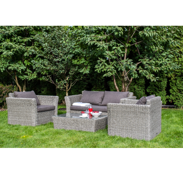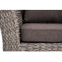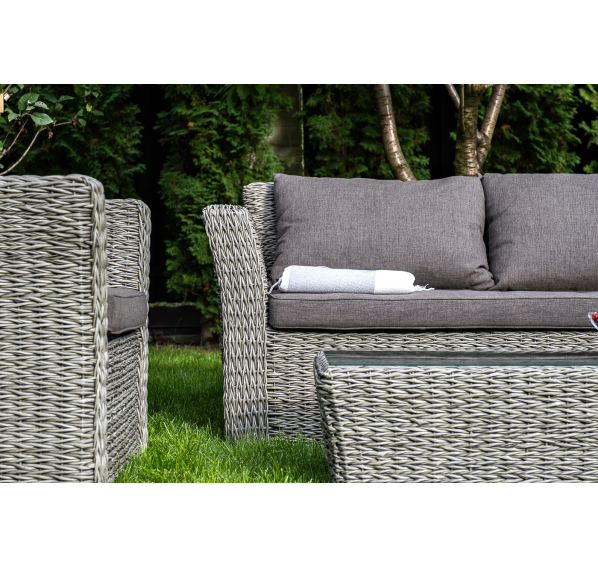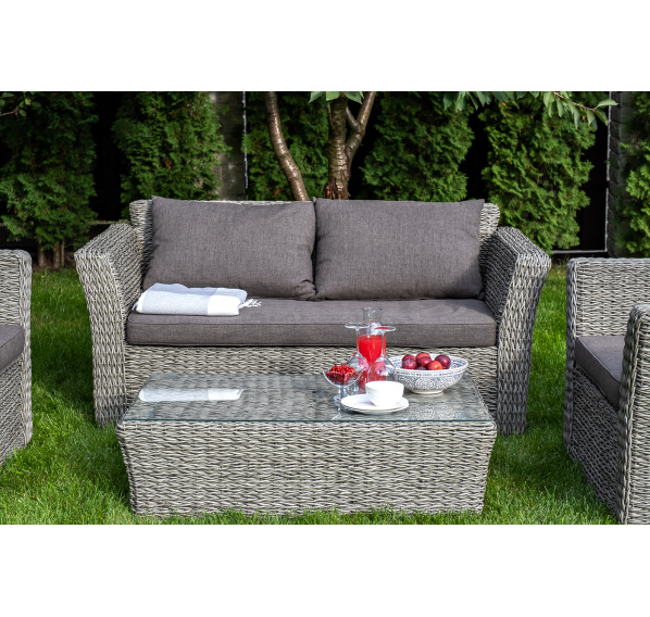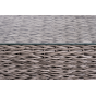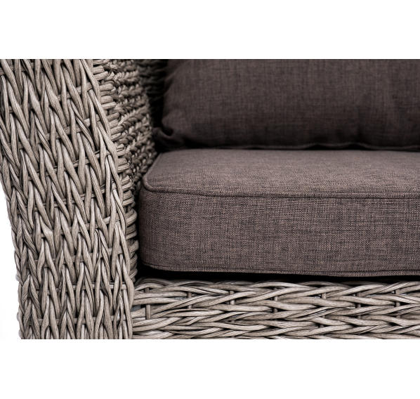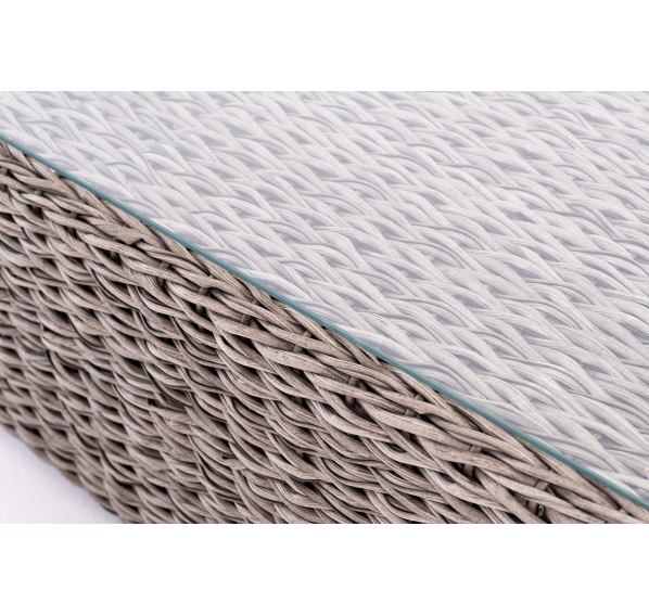 Прочный алюминиевый каркас усиливает устойчивость мебели. Его дополняет плетение в сером цвете, которое представлено из искусственного ротанга вида "гиацинт".
