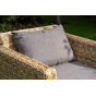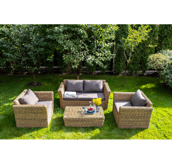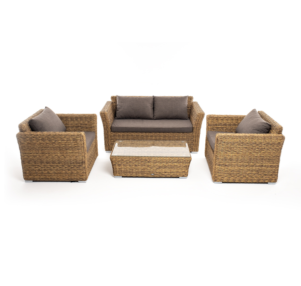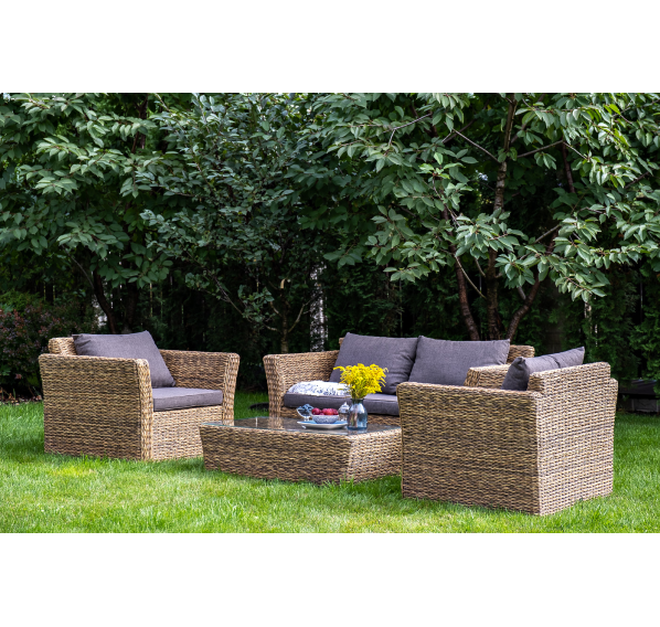 Прочный алюминиевый каркас усиливает устойчивость мебели. Его дополняет соломенная оплетка, которая представлена из искусственного ротанга вида "гиацинт".
