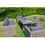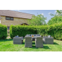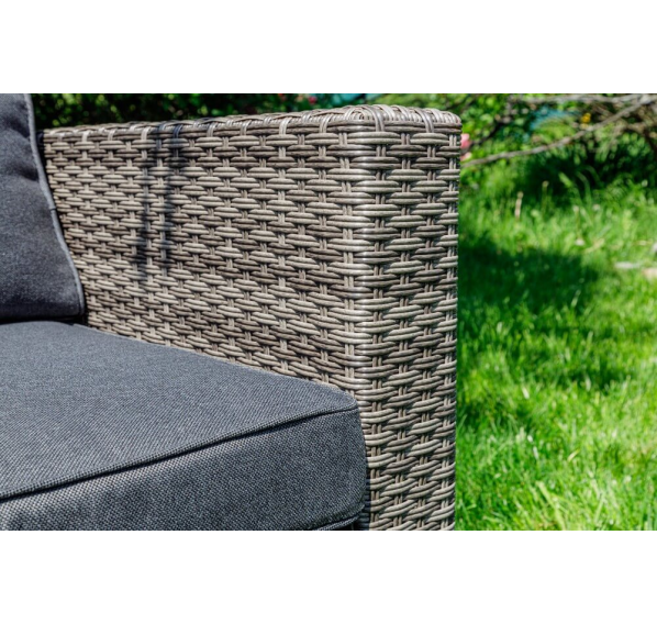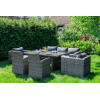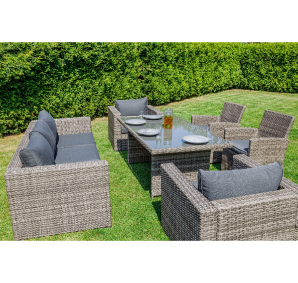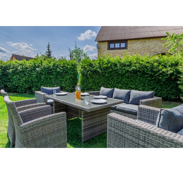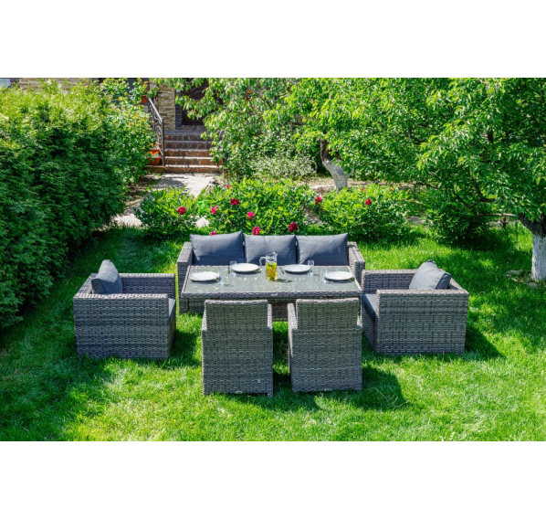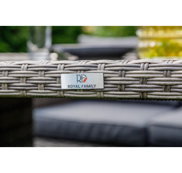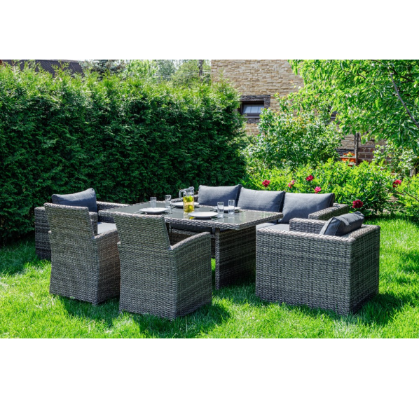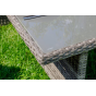 Комплект мебели KARL с обеденным столом в сером цвете — это элегантное и удобное решение для вашей столовой или гостиной. Он состоит из трехместного дивана, двух кресел и обеденного стола, изготовленных из искусственного ротанга на металлическом каркасе.