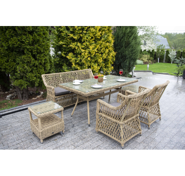 Все предметы мебели изготовлены из прочного алюминия, вручную оплетенного долговечным искусственным ротангом. На креслах и диване предусмотрены подушки со съёмными чехлами и влагостойкой пропиткой. Стол укомплектован прочным стеклом толщиной 5 мм для удобства использования.