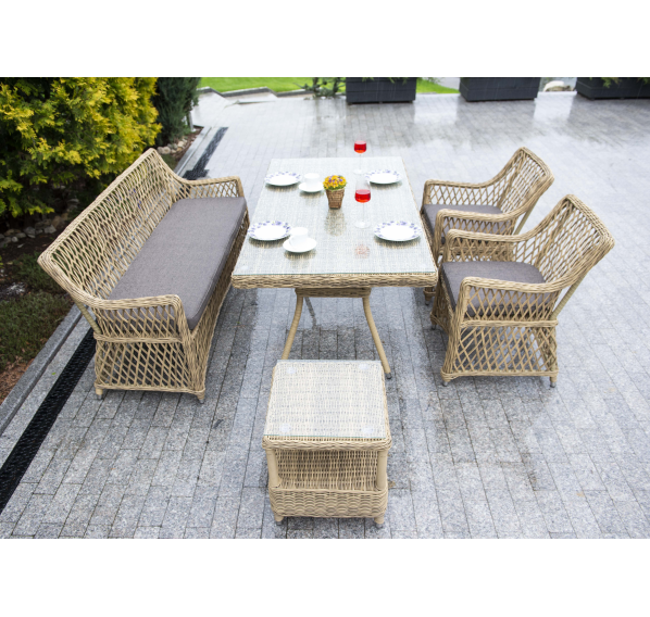 Обеденная группа выполнена в натуральном соломенном цвете и дополнит любой экстерьер в классическом стиле.