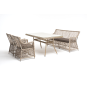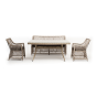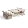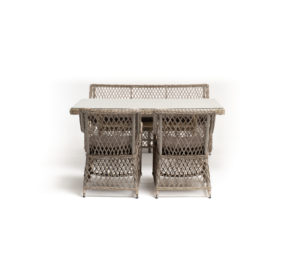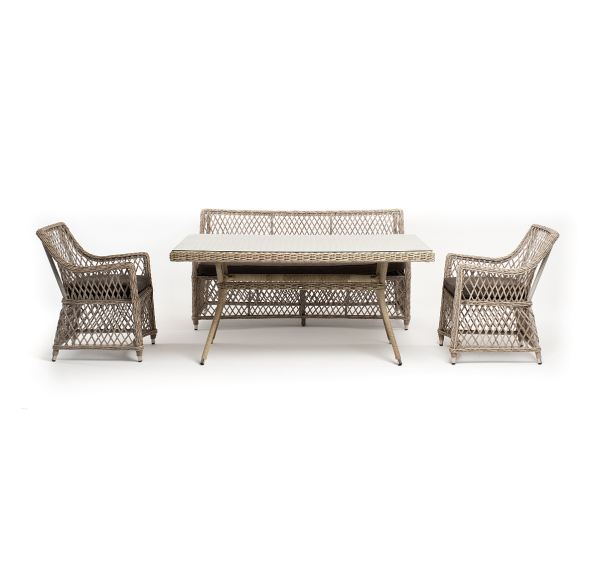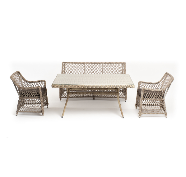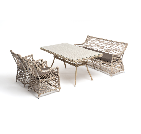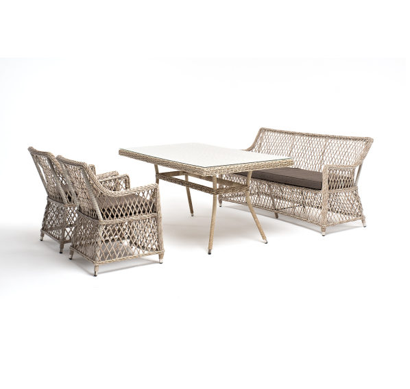 Все предметы мебели изготовлены из прочного алюминия, вручную оплетенного долговечным искусственным ротангом. На креслах и диване предусмотрены подушки со съёмными чехлами и влагостойкой пропиткой. Стол укомплектован прочным стеклом толщиной 5 мм для удобства использования.