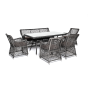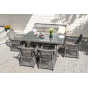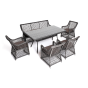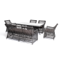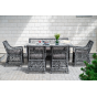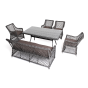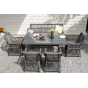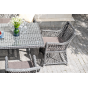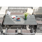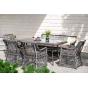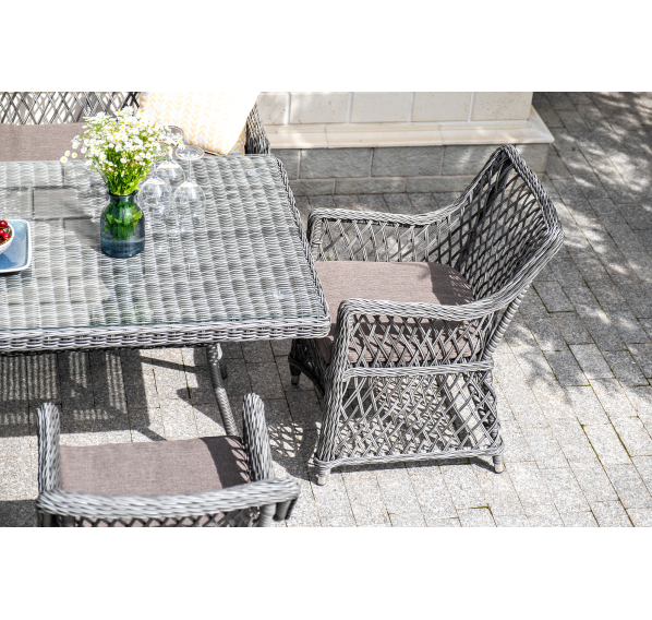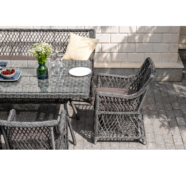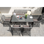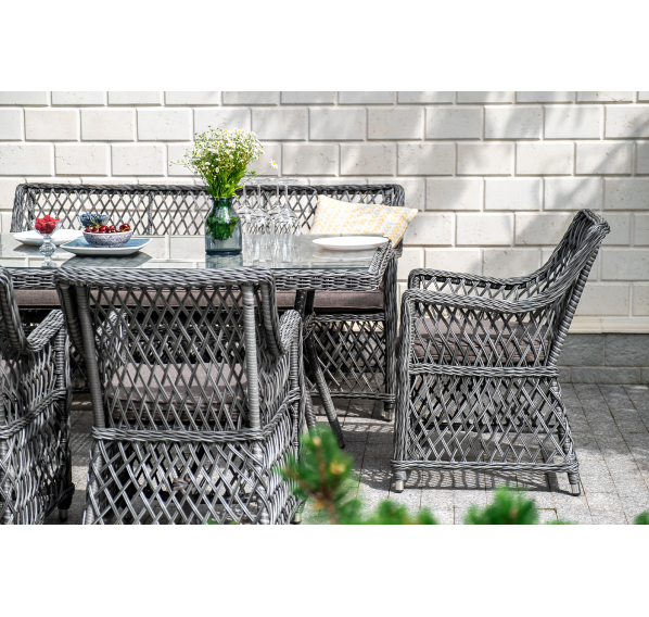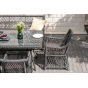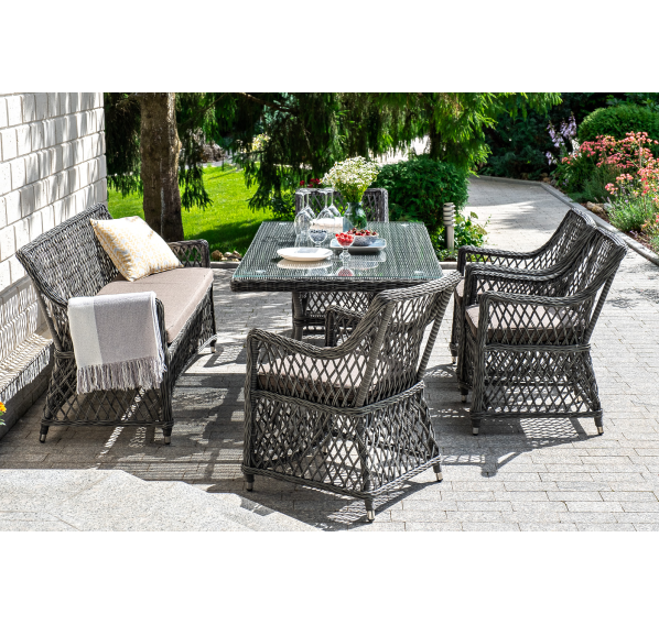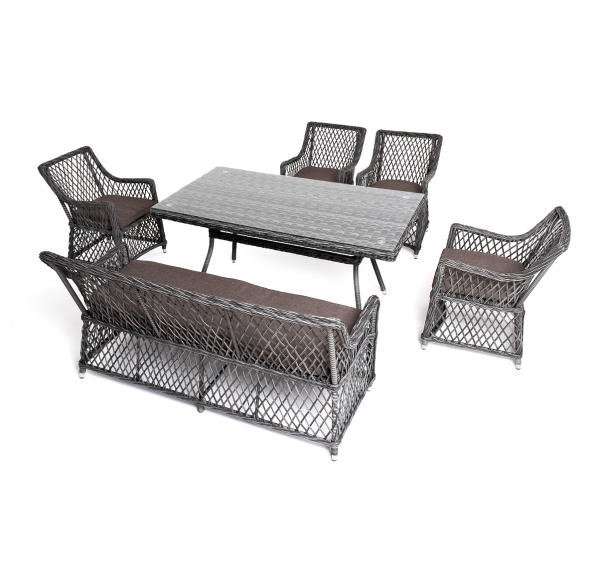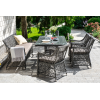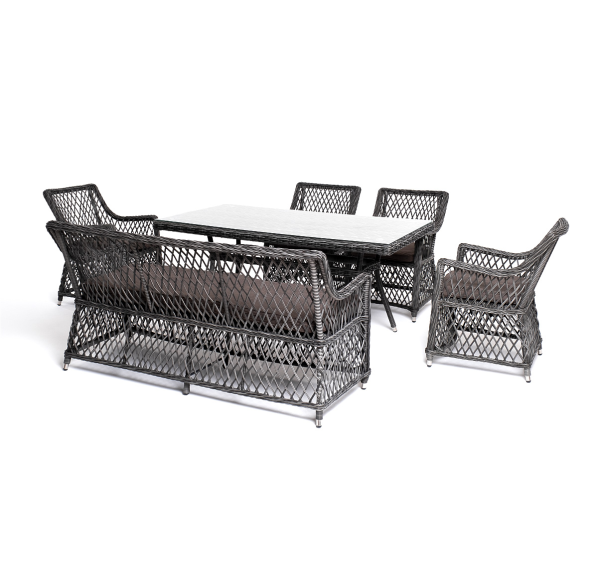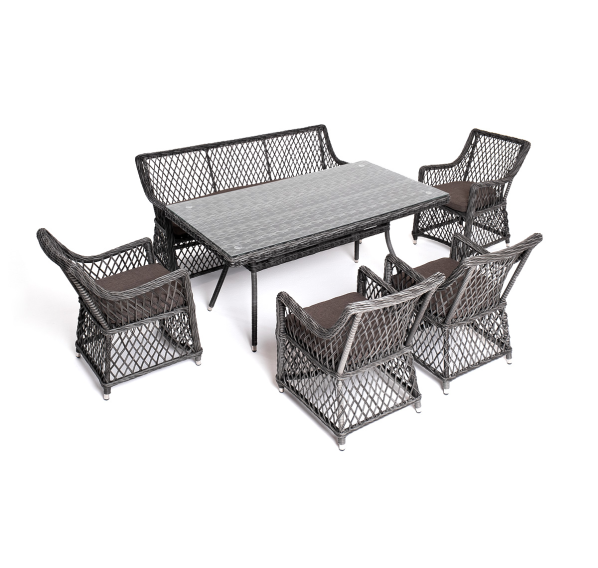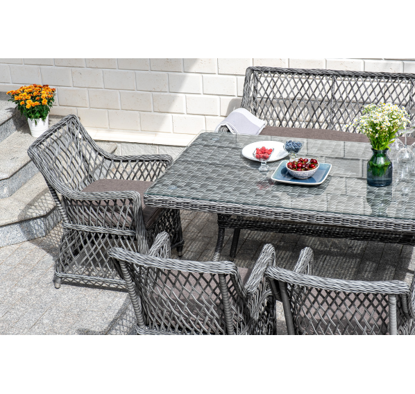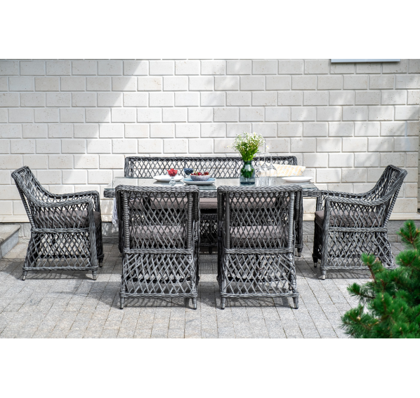 Обеденная группа выполнена в цвете графит. Комплект дополнит любой экстерьер в классическом стиле.