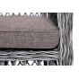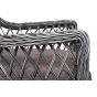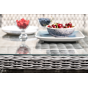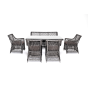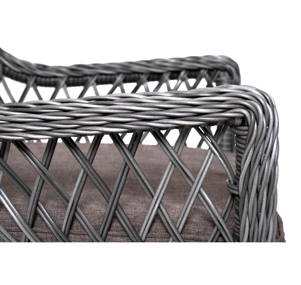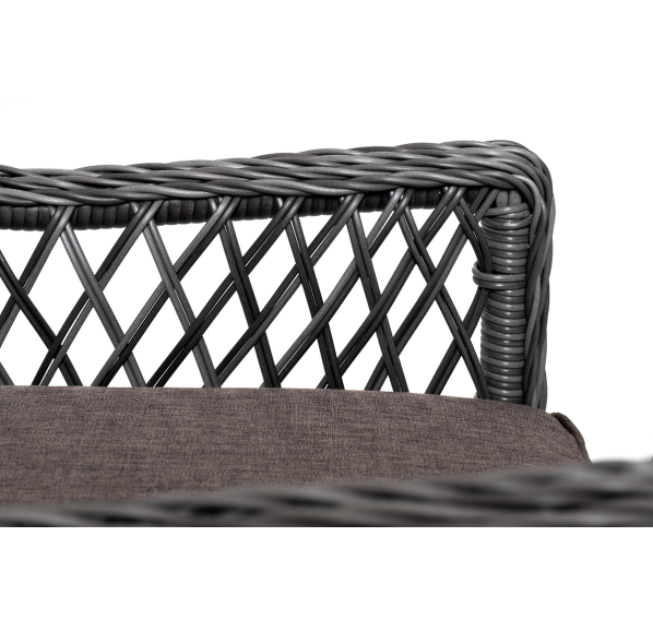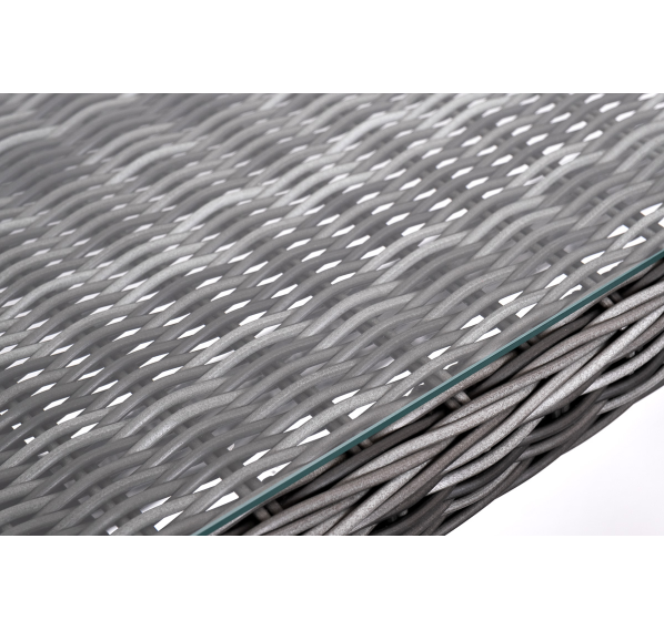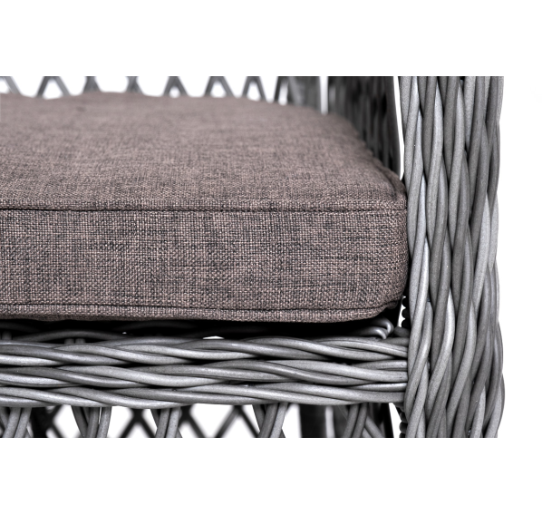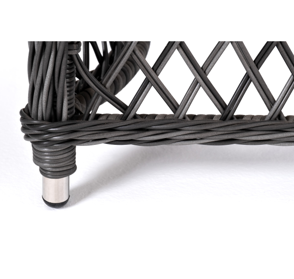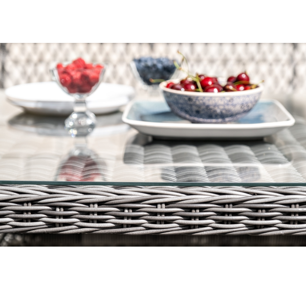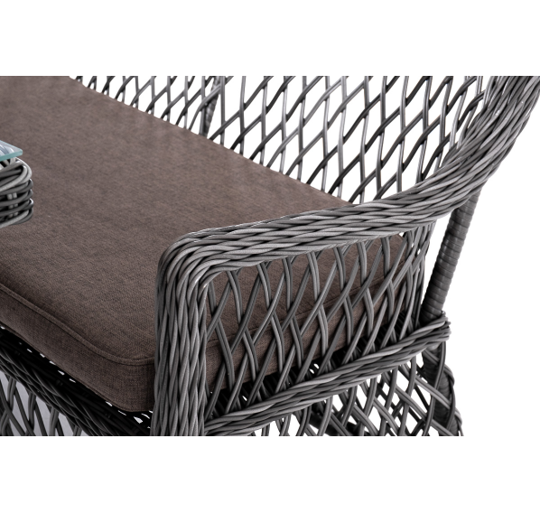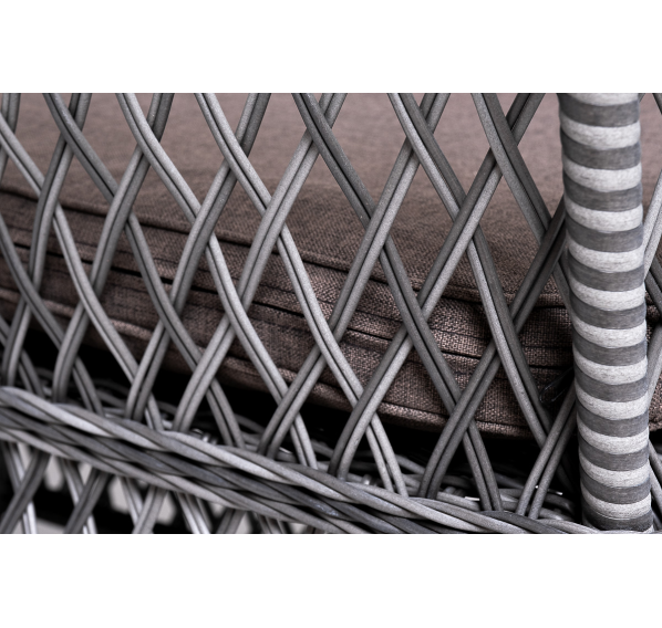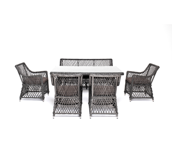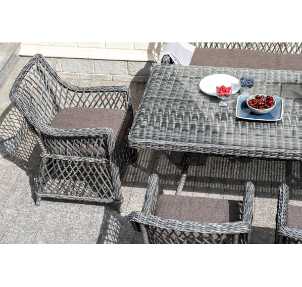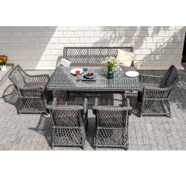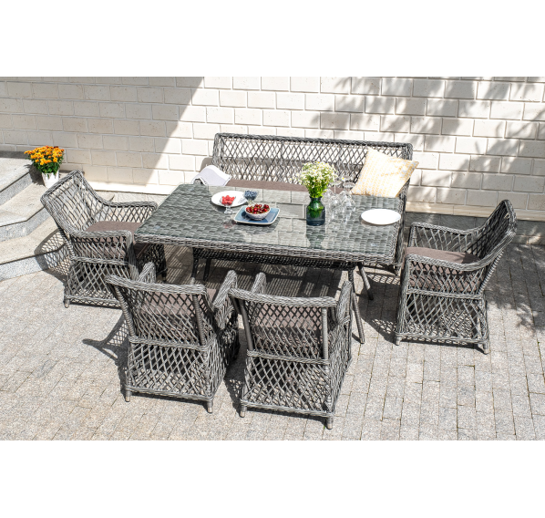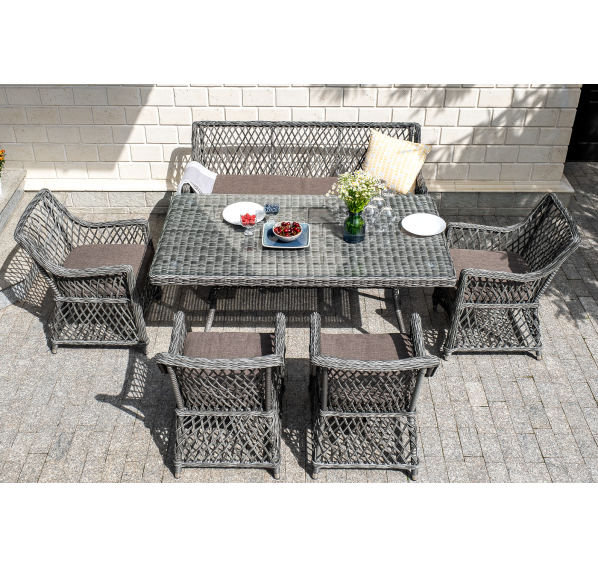 Все предметы мебели изготовлены из прочного алюминия, вручную оплетенного долговечным искусственным ротангом. На креслах и диване предусмотрены подушки со съёмными чехлами и влагостойкой пропиткой. Стол укомплектован прочным стеклом толщиной 5 мм для удобства использования.