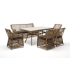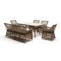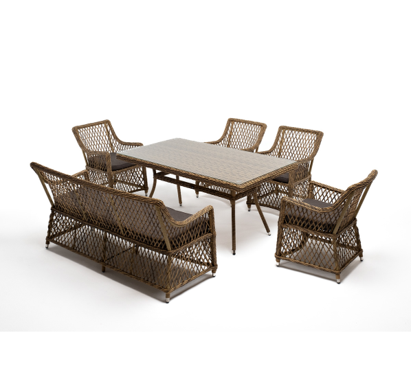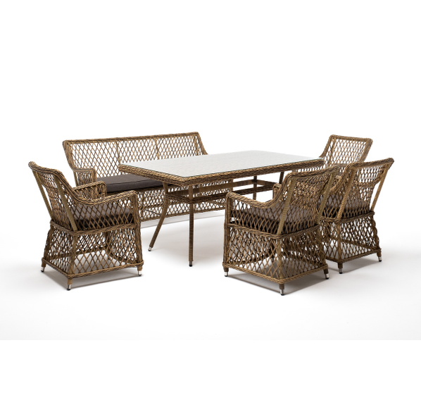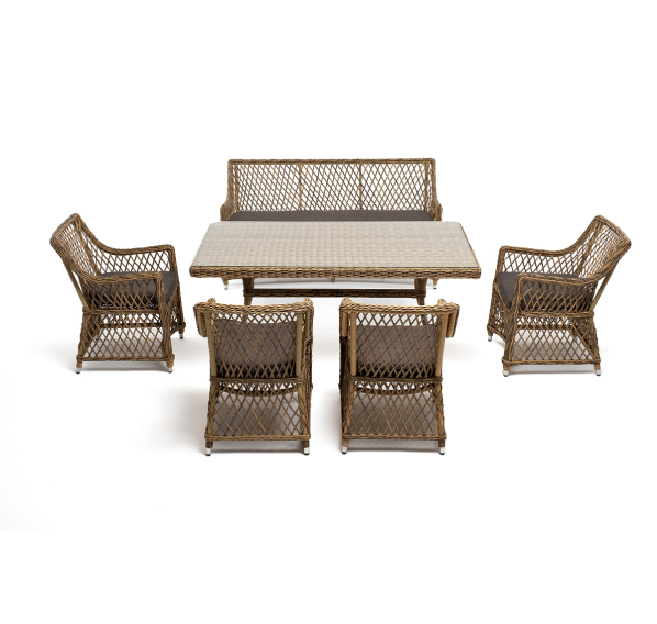 Обеденная группа выполнена в натуральном соломенном цвете. Комплект дополнит любой экстерьер в классическом стиле.
