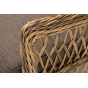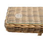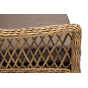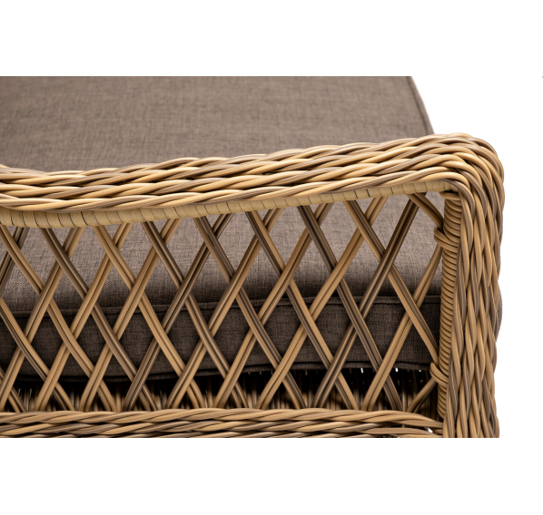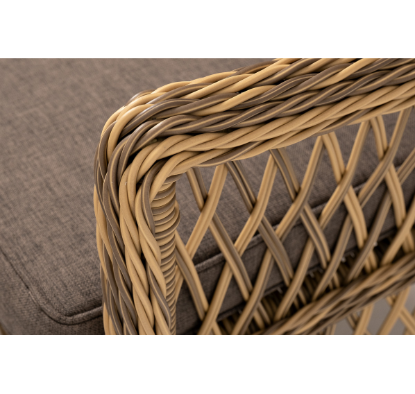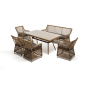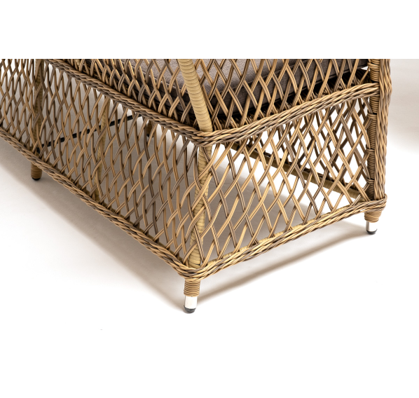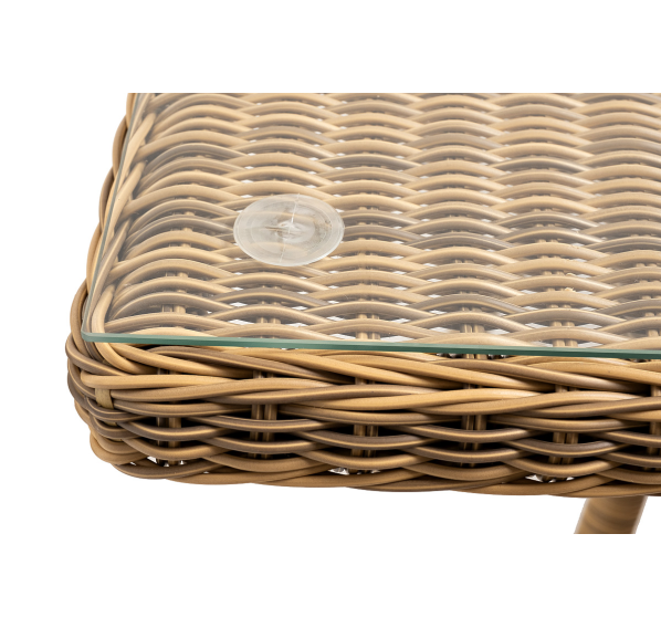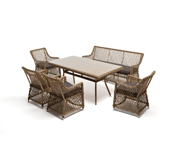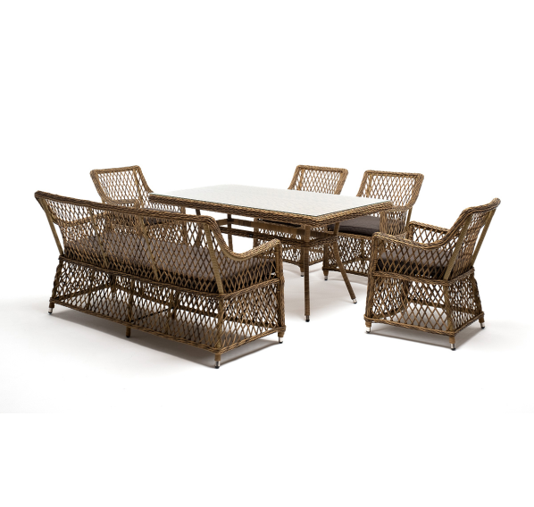 Все предметы мебели изготовлены из прочного алюминия, вручную оплетенного долговечным искусственным ротангом. На креслах и диване предусмотрены подушки со съёмными чехлами и влагостойкой пропиткой. Стол укомплектован прочным стеклом толщиной 5 мм для удобства использования.