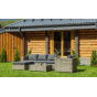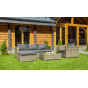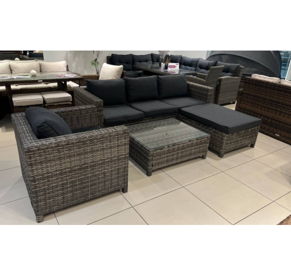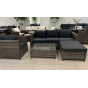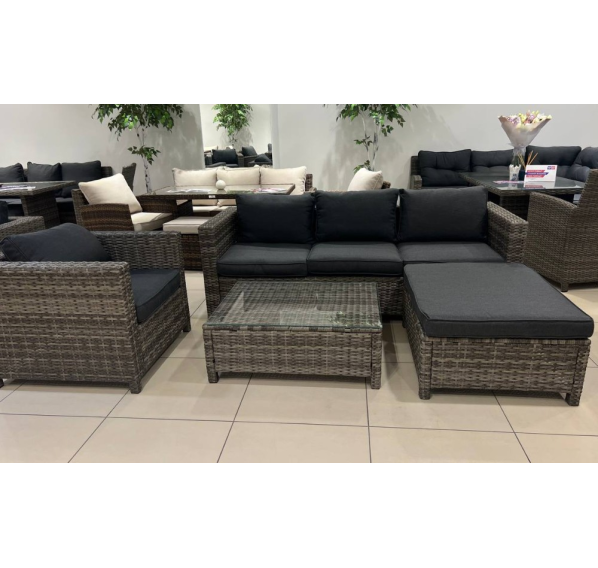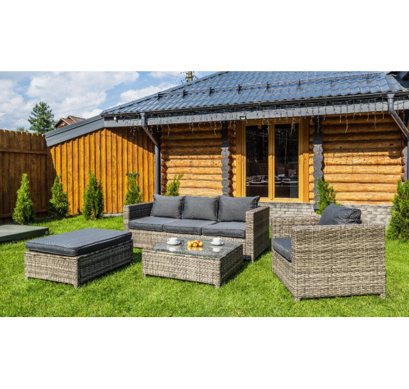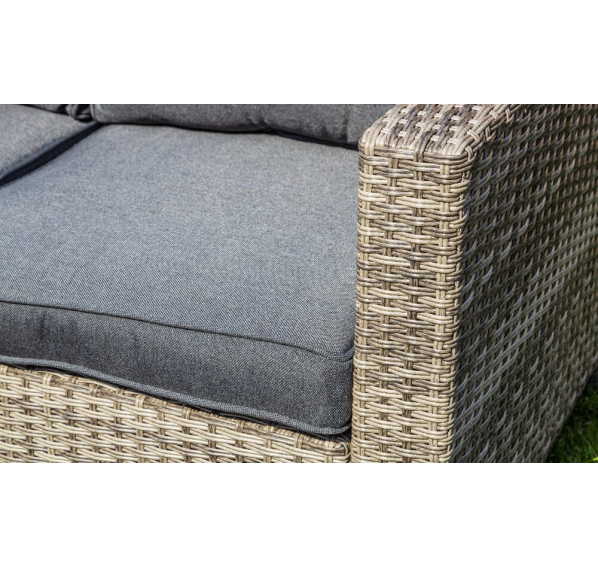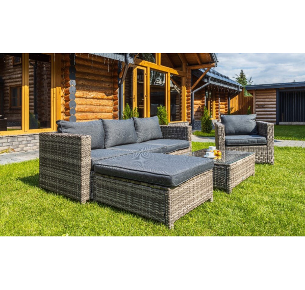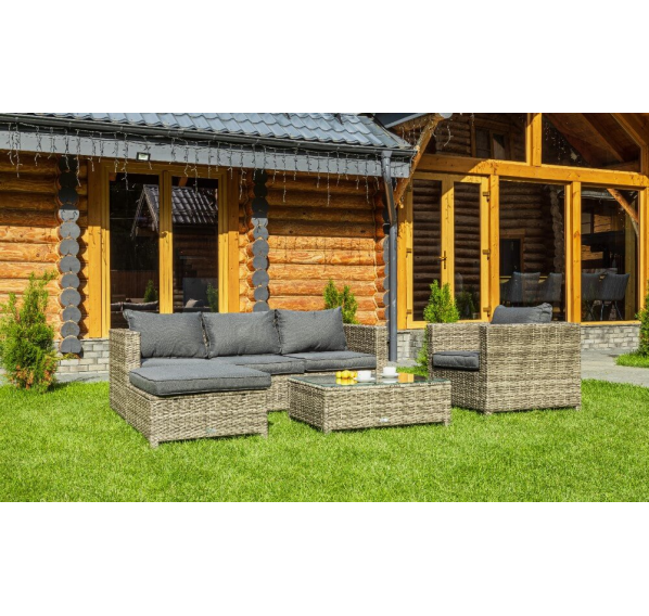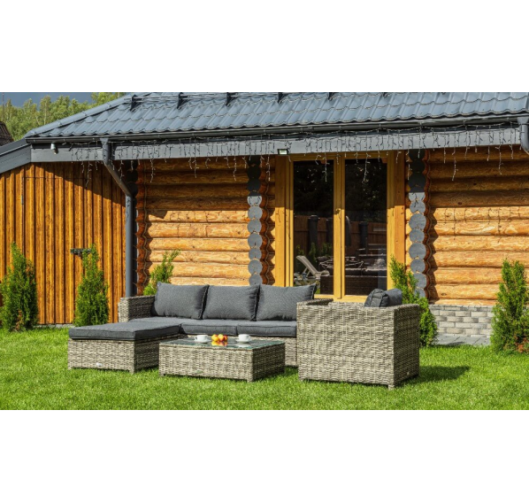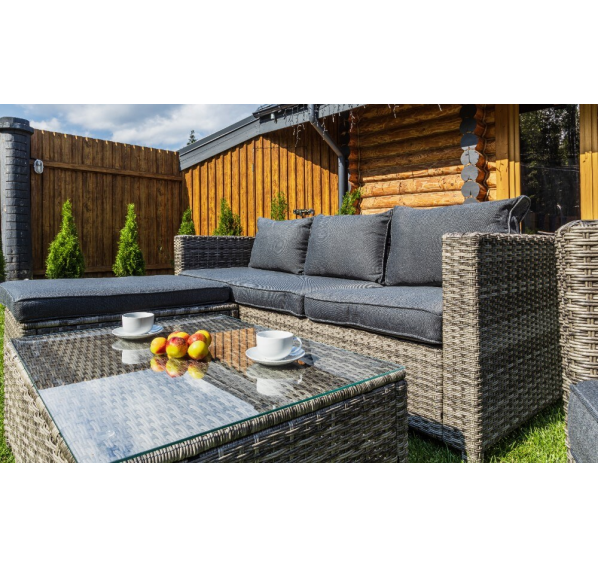 Угловой комплект уличной мебели GRAND VICKY из техноротанга выполнен в современном сдержанном дизайне с использованием натуральных серых оттенков. Благодаря компактным габаритам набор можно установить не только на территории приусадебного участка, но и на небольшой придомовой террасе.