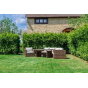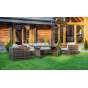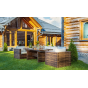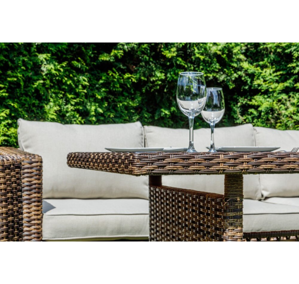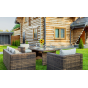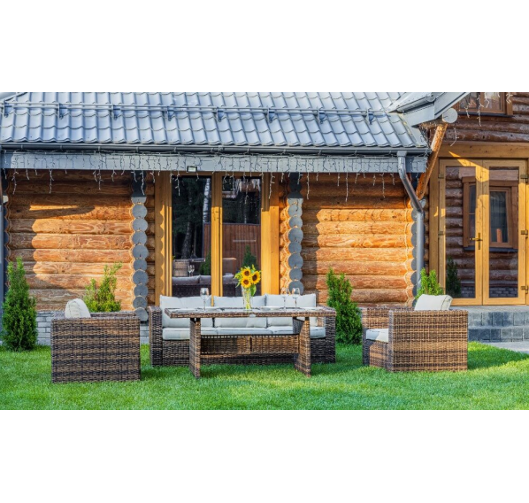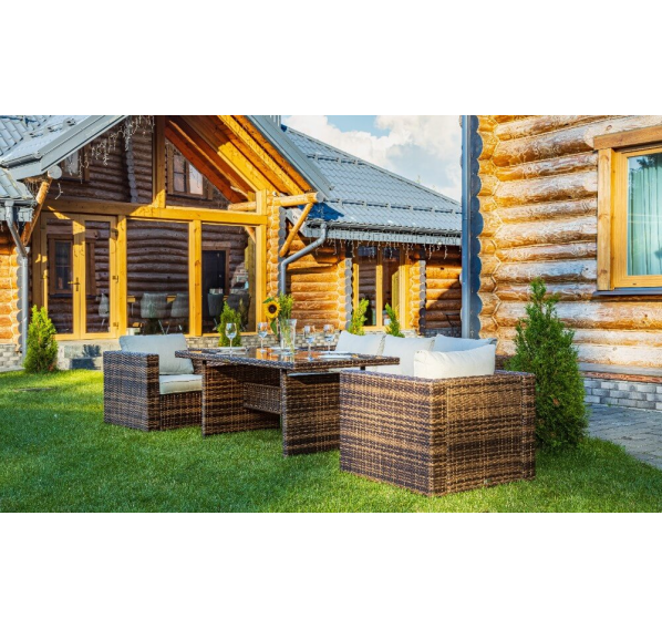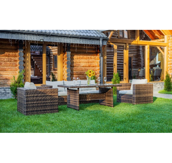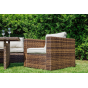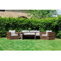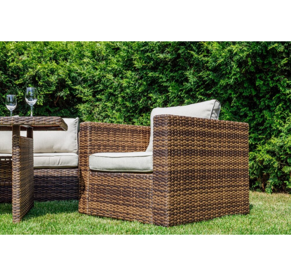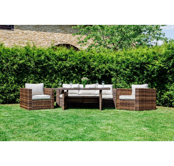 Комплект мебели KARL с обеденным столом в коричневом цвете — это элегантное и удобное решение для вашей столовой или гостиной. Он состоит из трехместного дивана, двух кресел и обеденного стола, изготовленных из искусственного ротанга на металлическом каркасе.