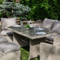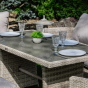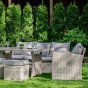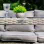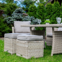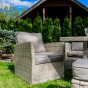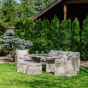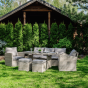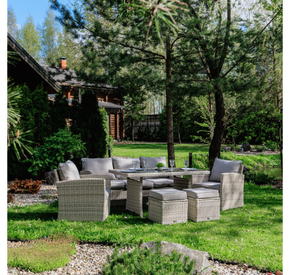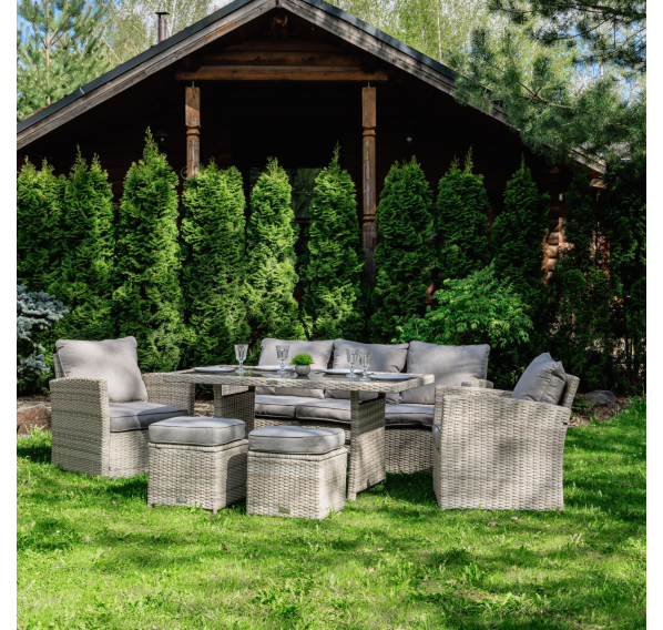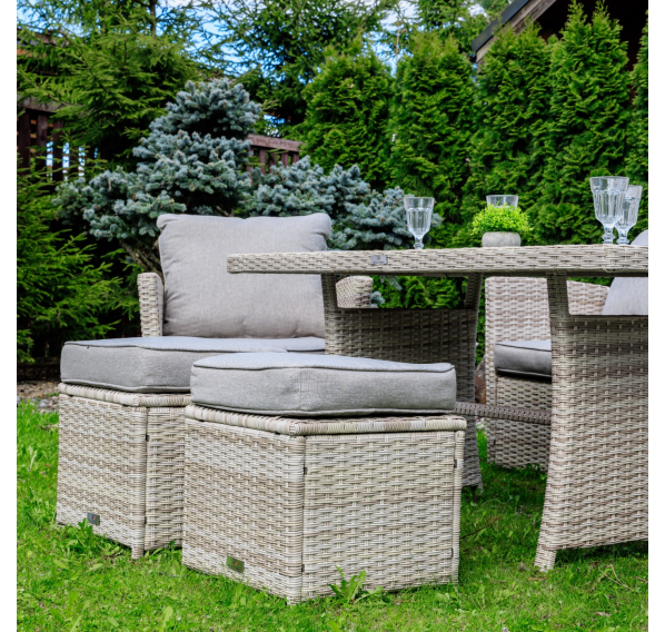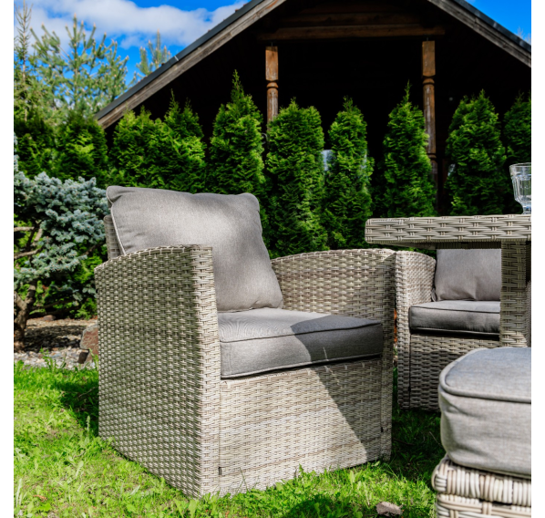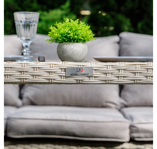 Мягкие подушки светло серого цвета с чехлами из водоотталкивающей ткани добавляют удобства и стиля. Вам не придется скрывать подушки при дожде. Особенностью гарнитуры является ручное плетение техноротанга в бежевом цвете, что придает ей современный и лаконичный вид, вписываясь идеально в любое окружение — будь то уединенный приусадебный сад или уютная терраса перед домом.
