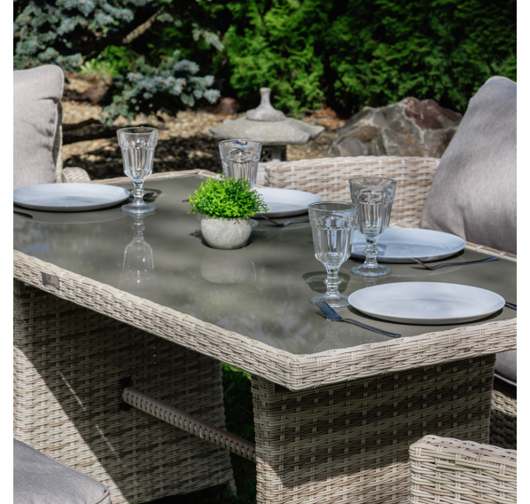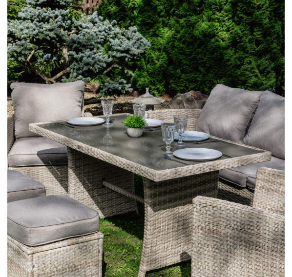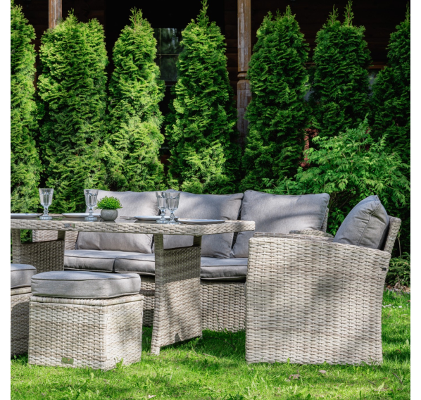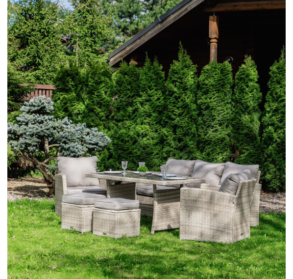 Добро пожаловать в мир элегантных и удобных наслаждений с комплектом садовой мебели ZOYA. Изготовленный из искусственного ротанга бежевого цвета, этот комплект сочетает в себе лучшие качества традиционных обеденных гарнитуров и уютных лаунж-зон. Позвольте себе наслаждаться семейными трапезами и отдыхом на протяжении всего года.