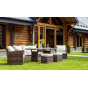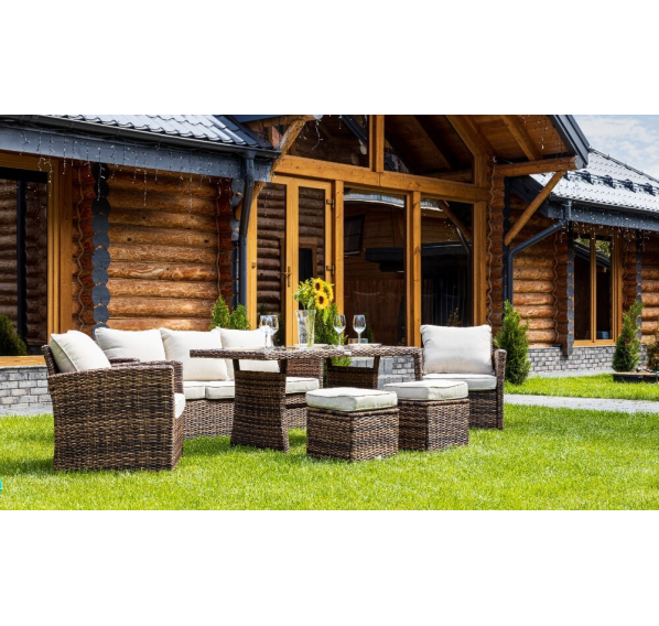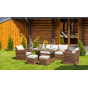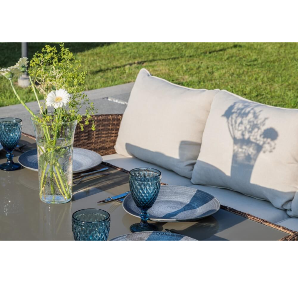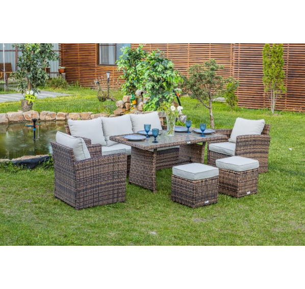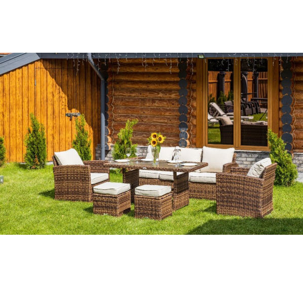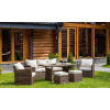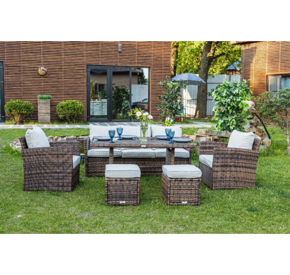 Выполненный из искусственного ротанга комплект садовой мебели ZOYA гармонично сочетает в себе основные качества традиционных обеденных гарнитуров и небольших лаунж-зон. Это делает его отменным решением для использования на приусадебном участке с целью семейных трапез и полноценного досуга на протяжении всего времени года.