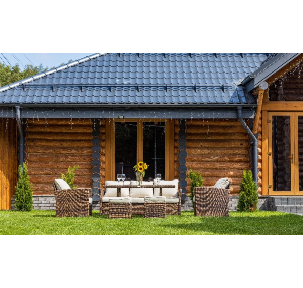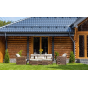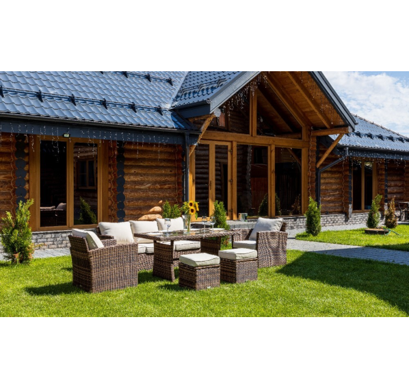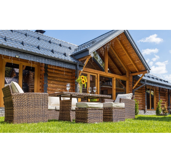 Гарнитур выполнен в современном лаконичном стиле с ручным плетением техноротанга темных коричневых оттенков. Это в совокупности со строгими линиями предметов делает мебель уместной в любом окружении, будь то тень приусадебного сада или придомовая терраса.